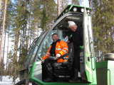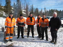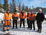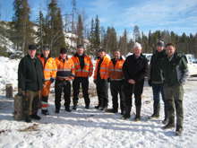 Beskrivning: Fr v: Per-Ola Eriksson, Birger Lahti, Tomas Erkki, Carl-Johan Tornberg, Torsten Hannu, Roland Niemi, Göran Persson, Herman Sundqvist och Patrick Bäckström. Göran Persson besöker Tärendö, mars 2009, avverkningslag