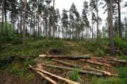 Beskrivning: Timmerbil, lastbil, timmerhög, avverkning