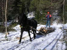 Beskrivning: Avverkning pågår i Ekopark Hornslandet, hästförare Kjell Larsson kör ett timmerlass.