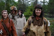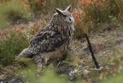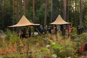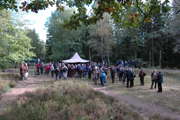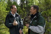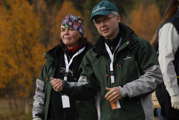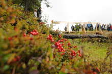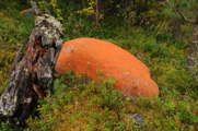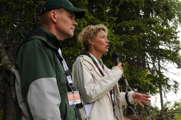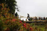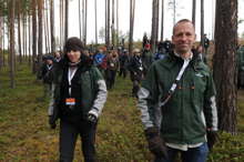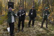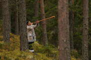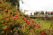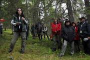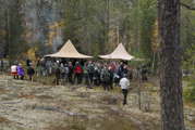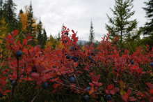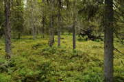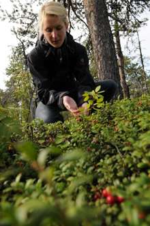 Beskrivning: Kvinna som plockar bär, lingon, i Ekopark Rosfors, bärplockning