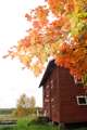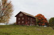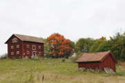 Beskrivning: Lada med höstfärgade lönnlöv i förgrunden. Ekopark Ridö Sundbyholmsarkipelagen.