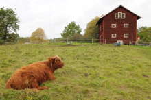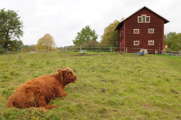 Beskrivning: Ko, kreatur i hage, Ekopark Ridö Sundbyholmsarkipelagen.