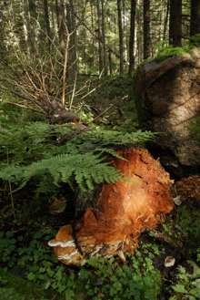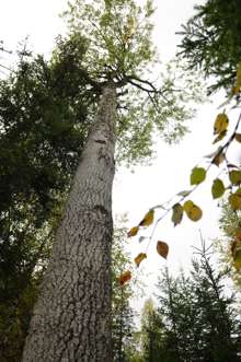 Beskrivning: Trädstam och lövverk. Ekopark Ridö Sundbyholmarkipelagen
