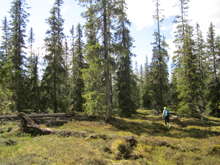 Beskrivning: Ekopark Karhuvaara, artsökning på granlåga, skog, gran, fälld, mossa