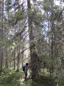 Beskrivning: Gammal grov gran med hänglav. Ekopark Tjadnes-nimtek