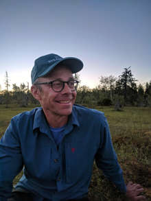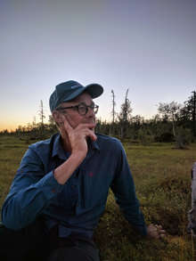 Beskrivning: Patrik Fredriksson, skogsvårdsledare i Kalix i 18-årig Tallskog. Hänglav i ung skog