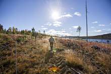 Beskrivning: Intraprenad. Man i skogen, efter avverkning, hygge, människa