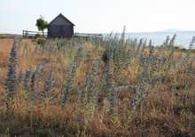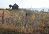 Beskrivning: Blåeld framför fiskebod i Ekopark Böda