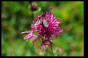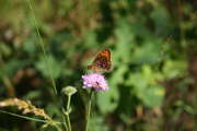 Beskrivning: Pärlemorfjäril och insekt (okänd) på vädd. Ekopark Böda.