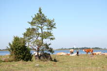 Beskrivning: Betesdjur, kor, kreatur på strandängar. Fyren Långe Erik i bakgrunden. Ekopark Böda.