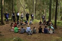 Beskrivning: Samling, gemenskap, barn, ring, sittandes i skogen, natur, skola, skolklass, grupp