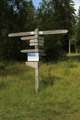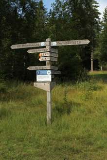 Beskrivning: Vägskylt, vägskäl, promenadväg, elljusspår, geologistigen, ekopark, skylt
