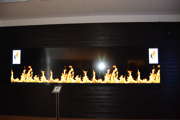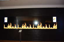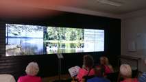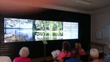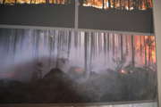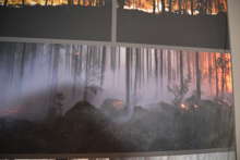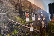 Beskrivning: Bilder på väggen, Besökscentrum, informationscentrum, Besökscenter Elden & Skogen i Ramnäs, för att visa vad som händer efter en skogsbrand, process, information, skogsbrand