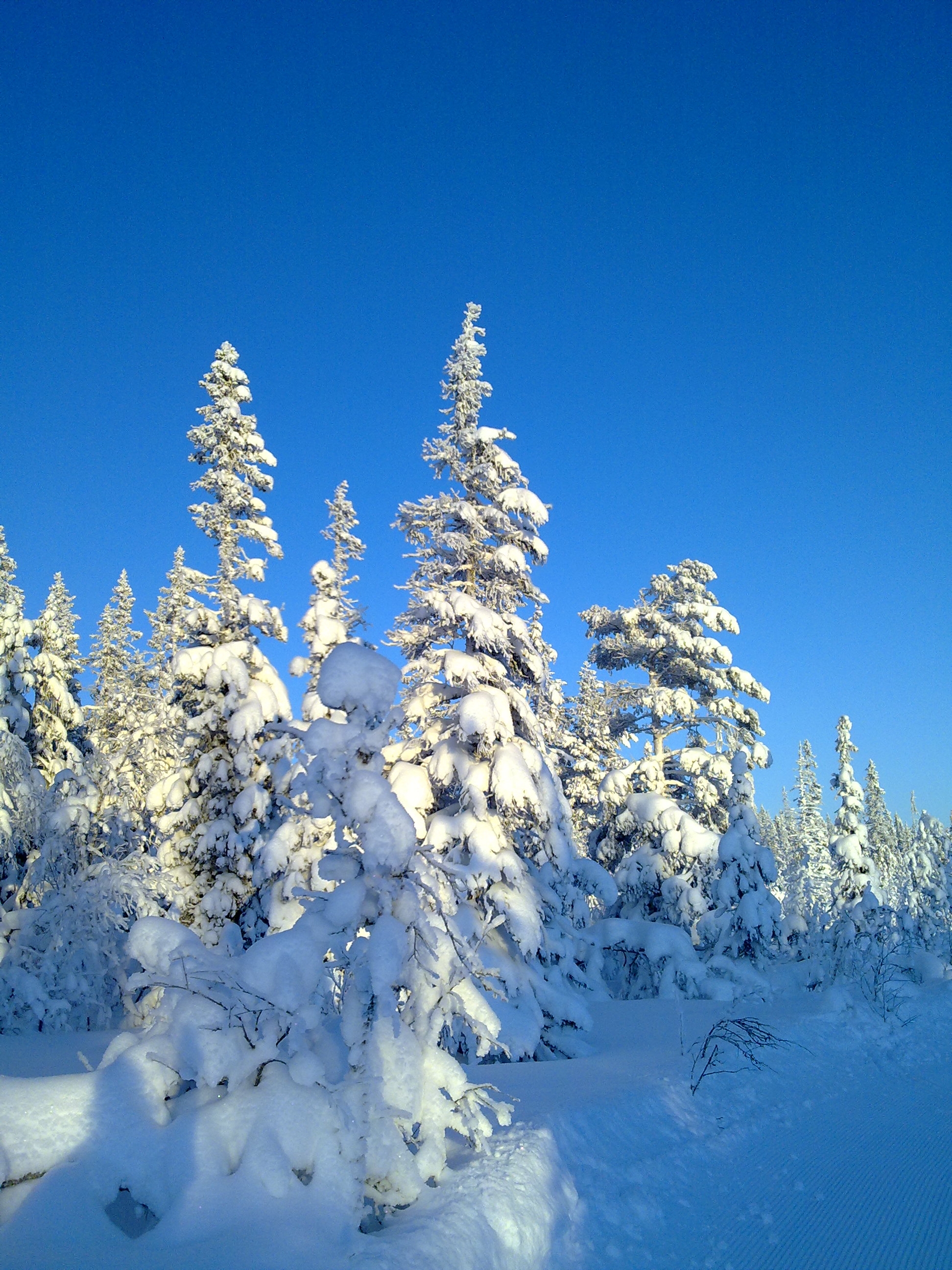 - Beskrivning: Höga granar, snö
