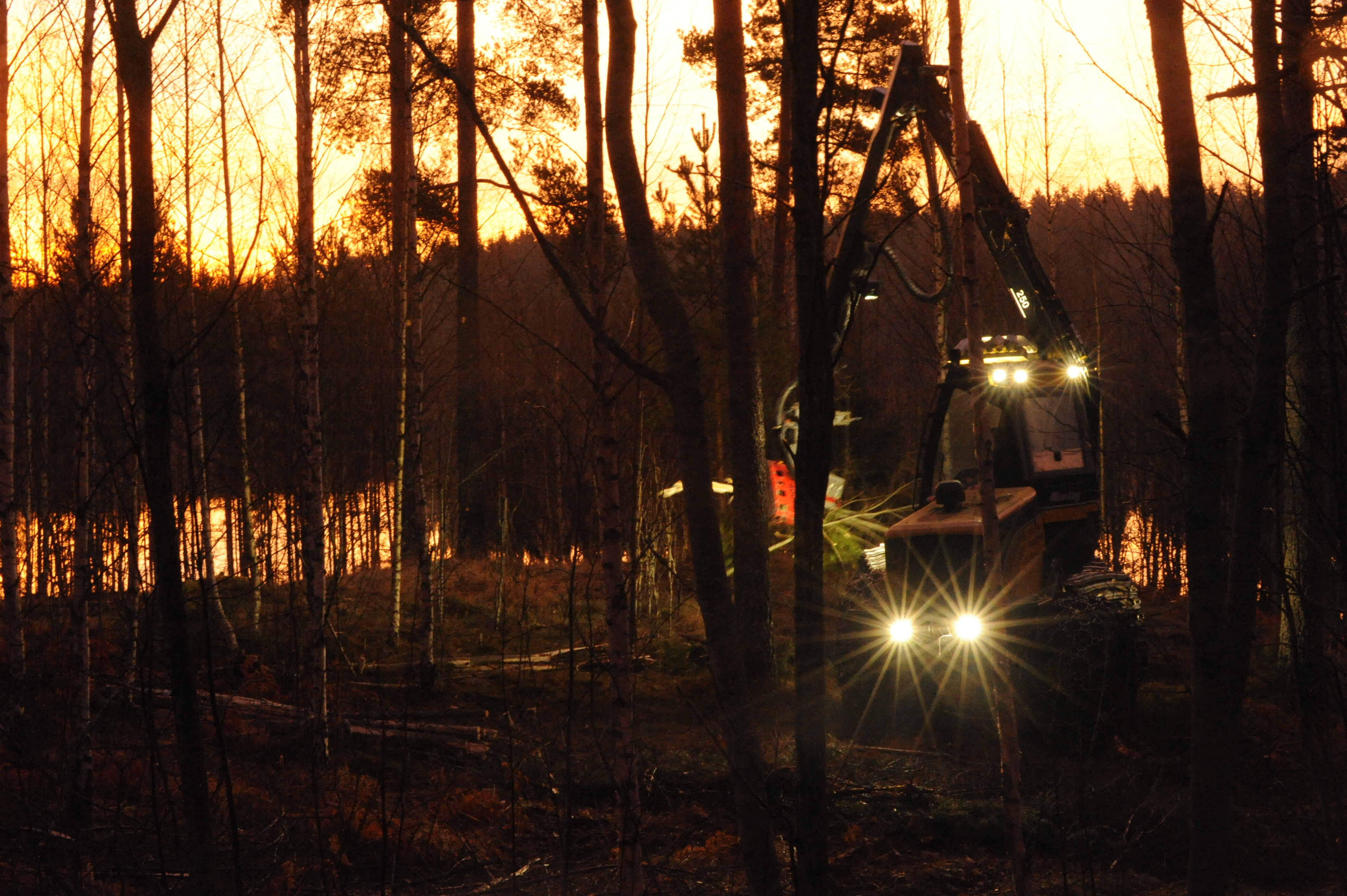 - Beskrivning: Gallringsskördare på natten, avverkning, gallring