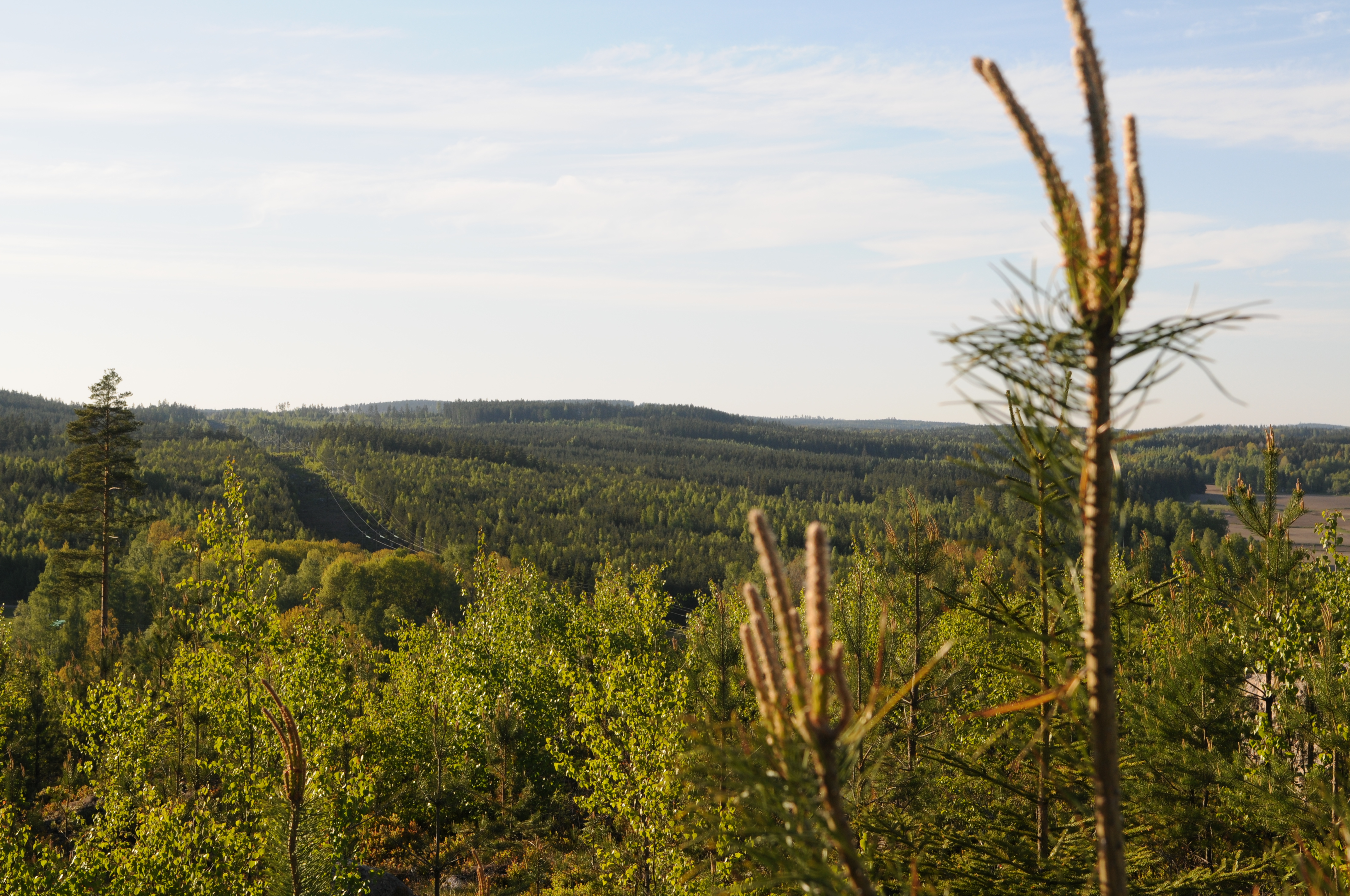 - Beskrivning: Landskap. Tall som skjuter skott i förgrunden