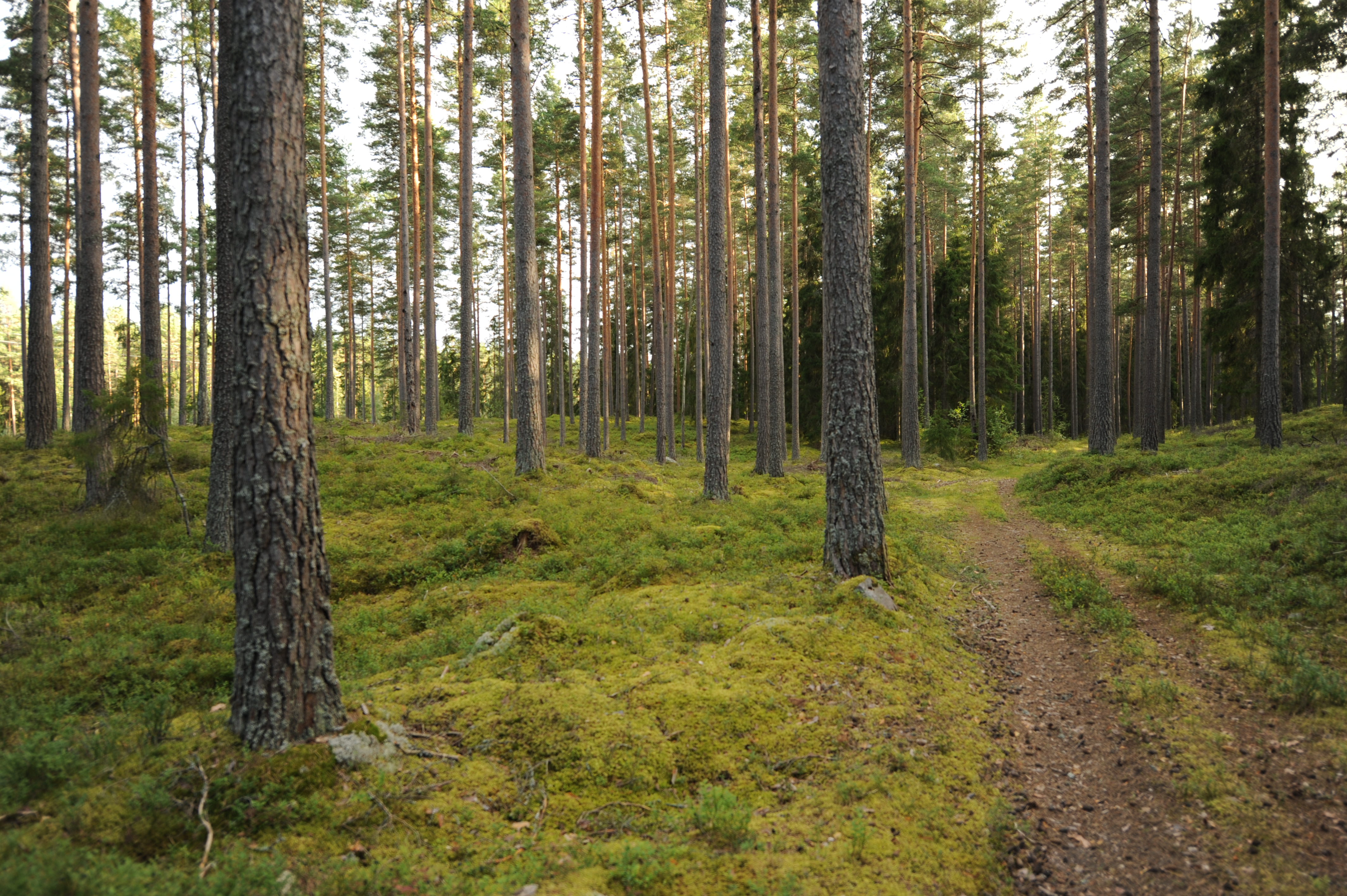 - Beskrivning: Tallar, skog, skogsväg, stig