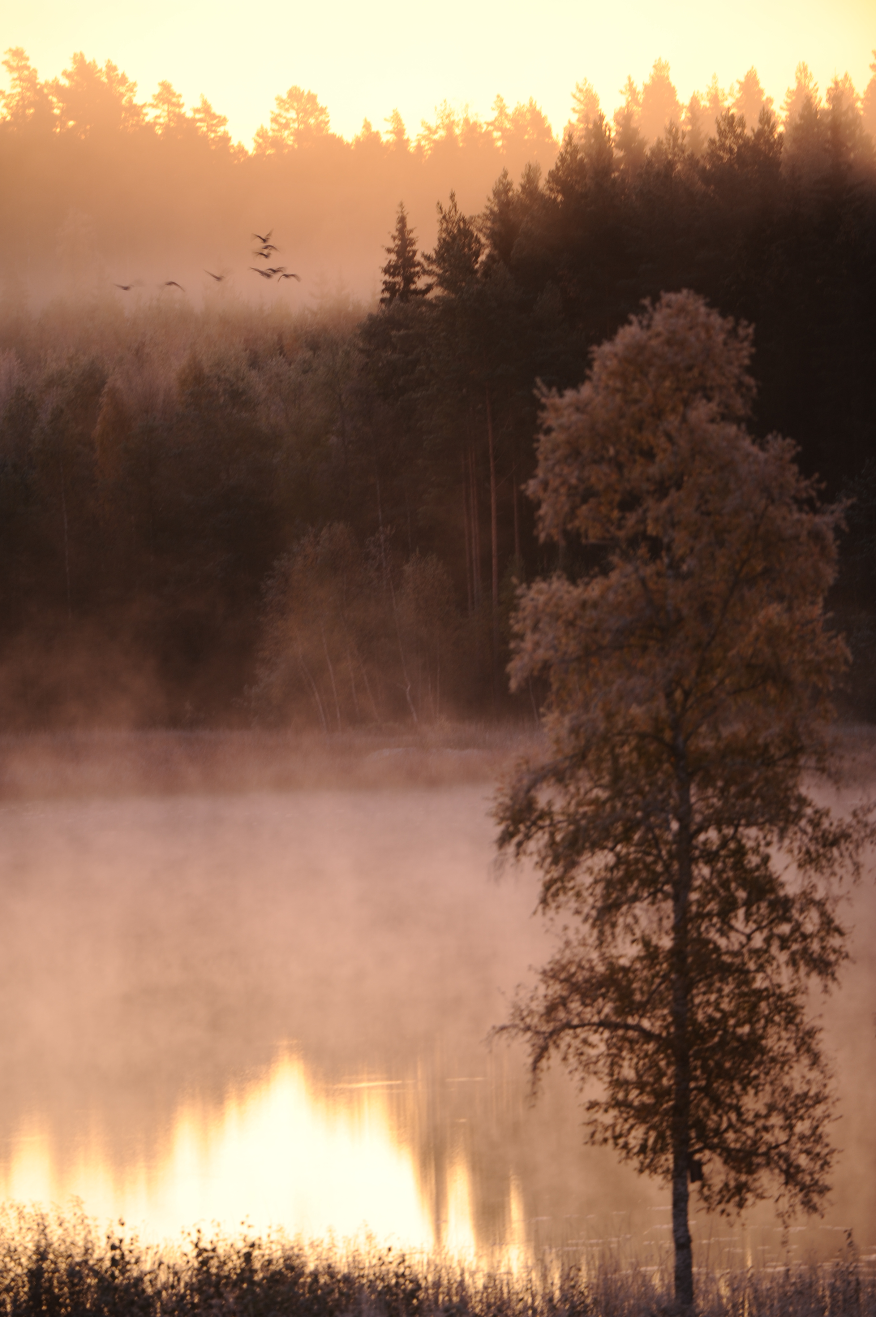 - Beskrivning: Dimma över sjö, rosa färger, frost