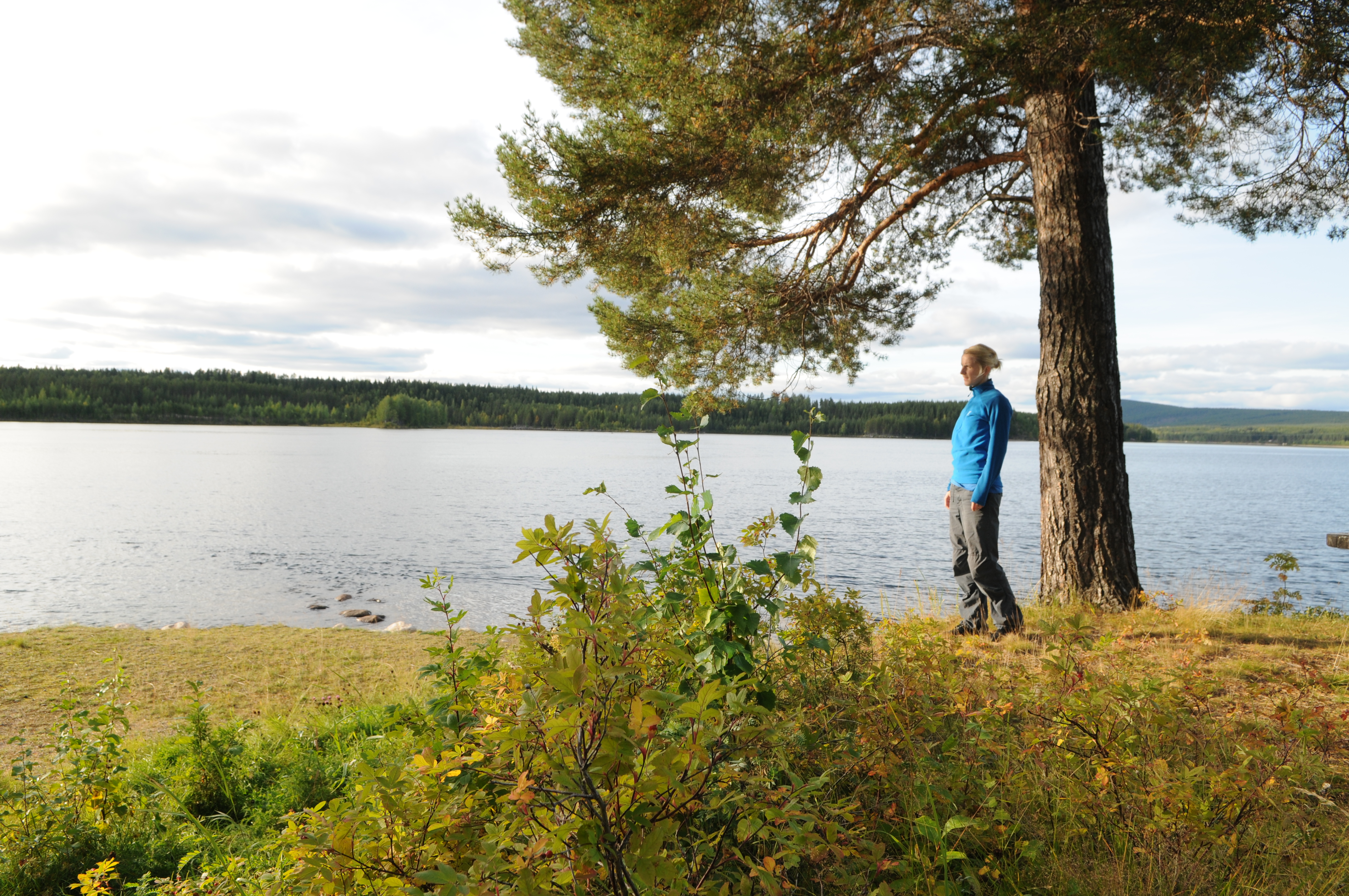 - Beskrivning: Kvinna tittar ut över utsikten i ekopark Vuollerim.