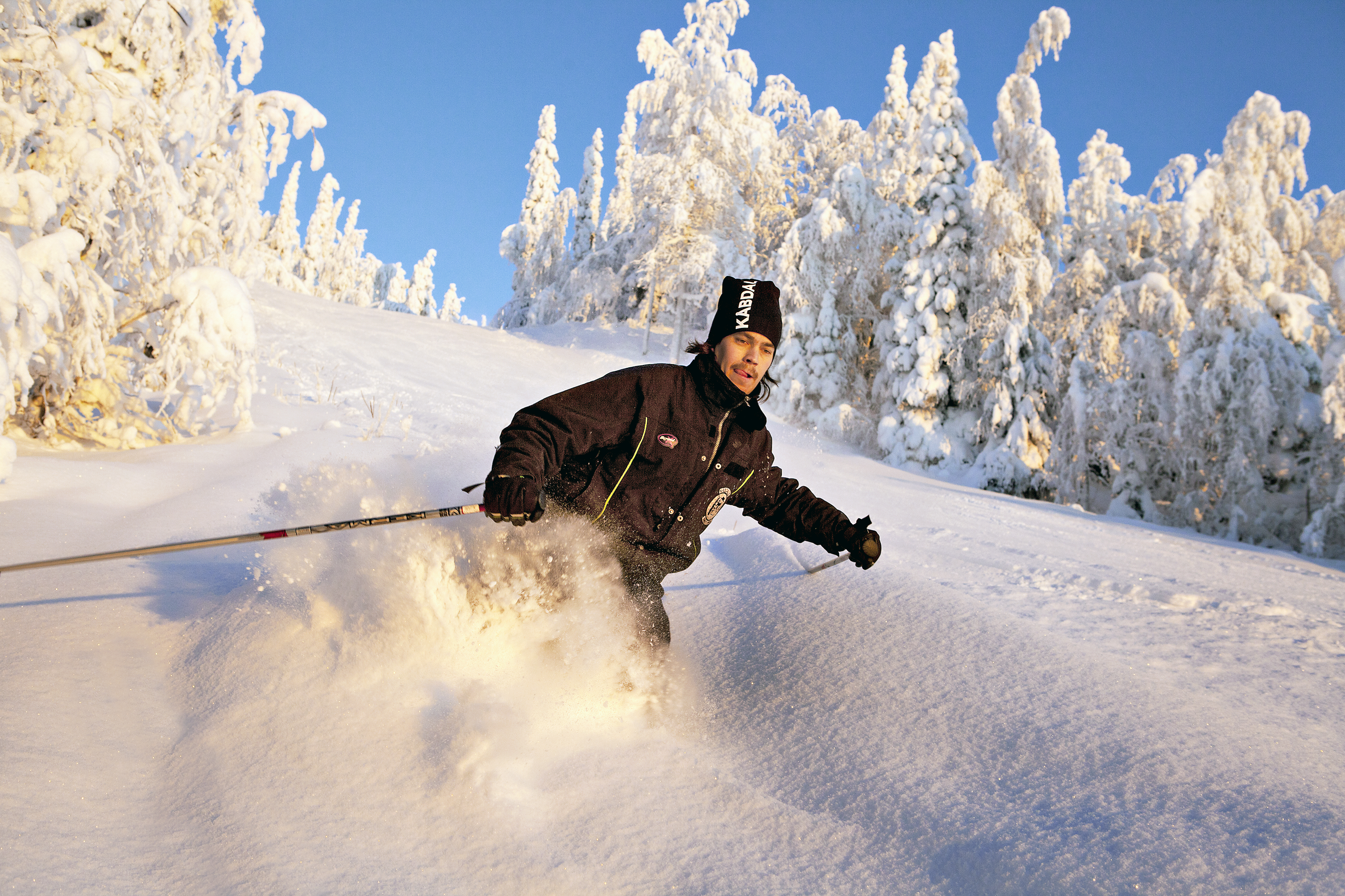 - Beskrivning: Skidåkare i lös snö. Nedfarten heter Långe David, uppkallad efter David Gunnarstedt (på bilden), son till Johan Gunnarstedt som driver anläggningen. Namnet anknyter också till den legendariske rallaren Långe David som en gång bodde i Kåbdalis. Skidor, slalom, slalombacke, utförsåkning.