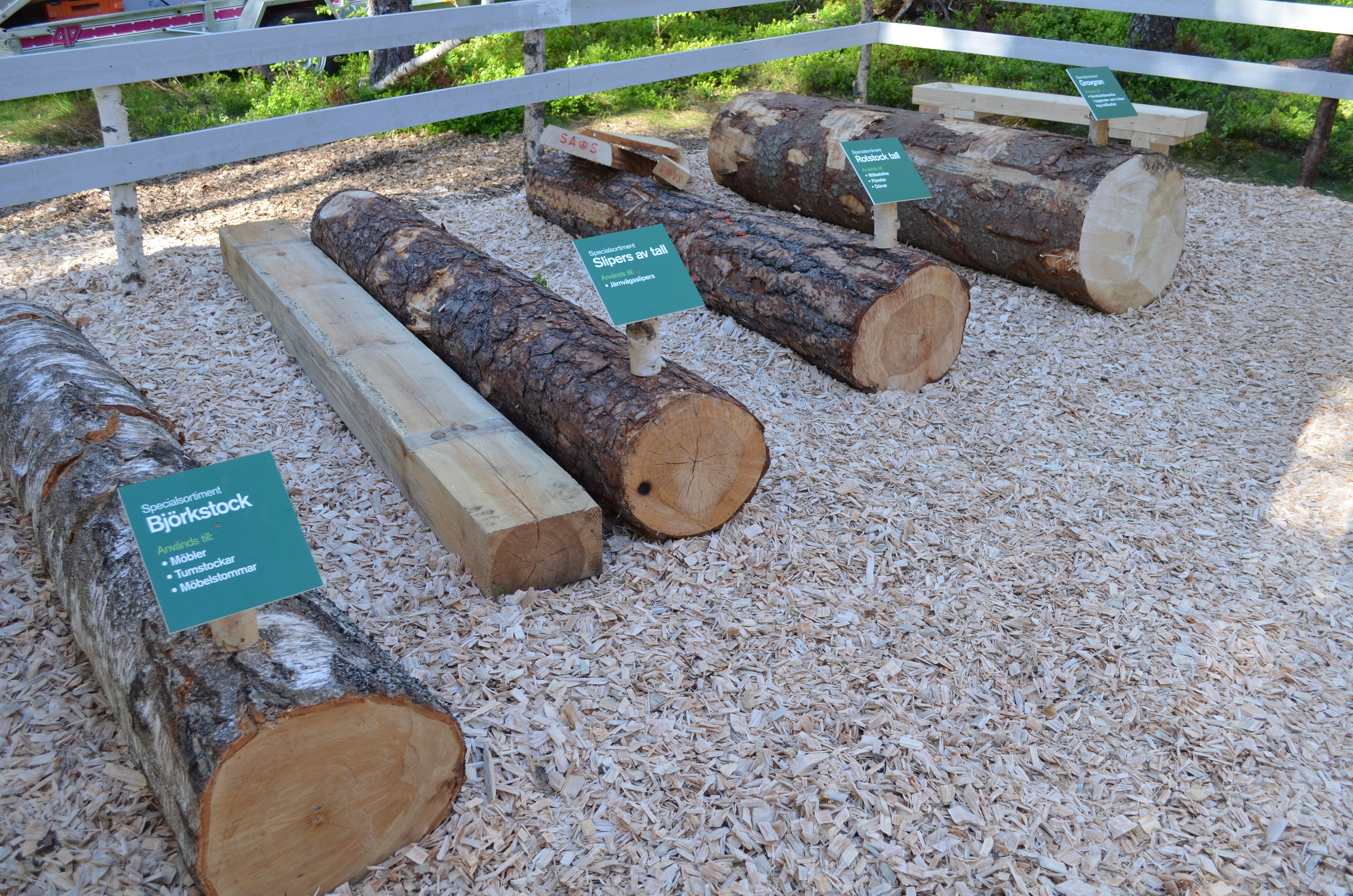 • Beskrivning: Sveaskogs medverkan på Elmia-mässan, Elmia Wood Sveaskog visar upp olika träsorter, björkstock, slipers av tall, rotstock tall, grovgran, stockar