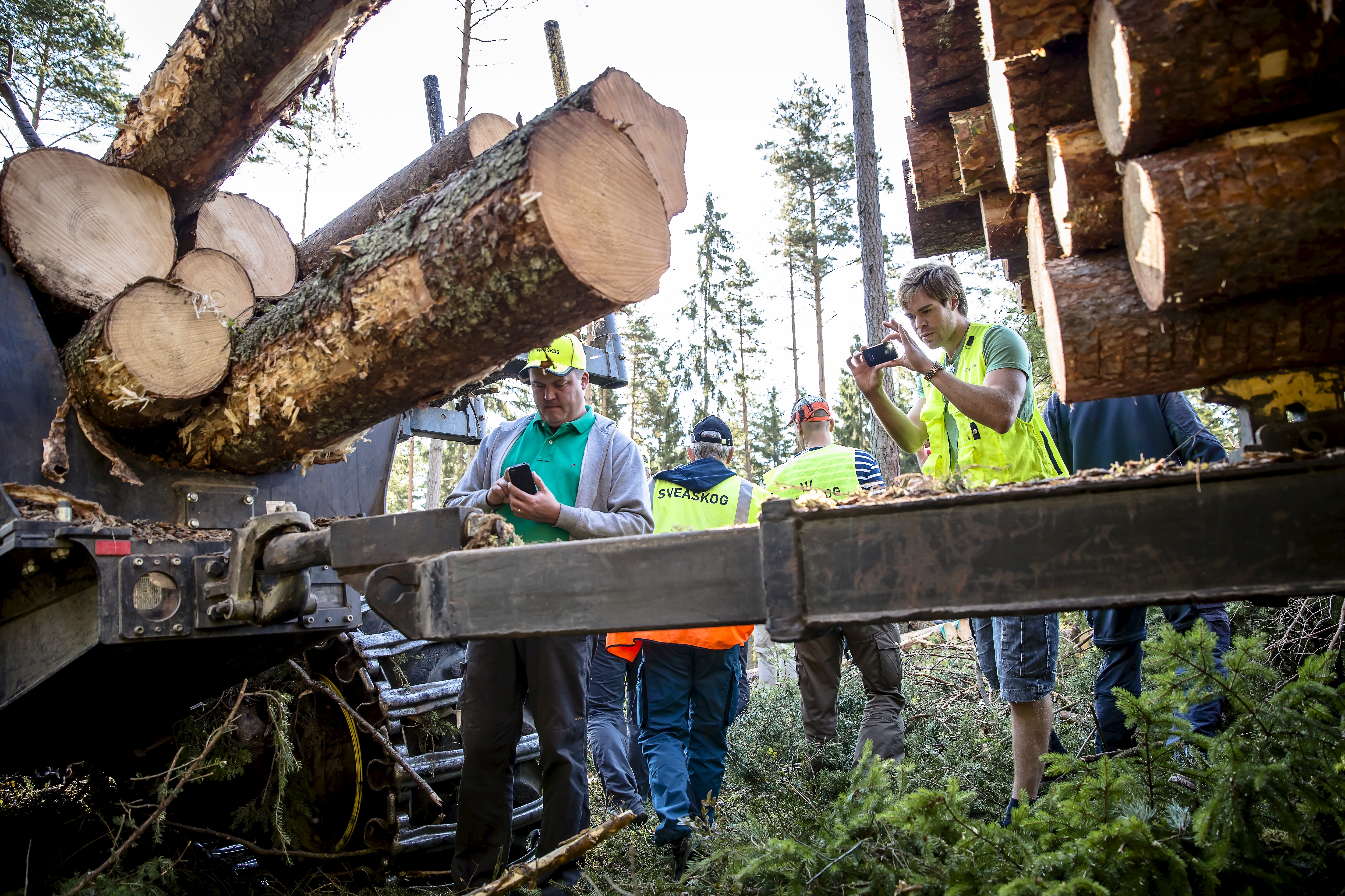 - Beskrivning: Tobias Norrbom och kollegor beundrar ny teknik och fotar, teknik, utveckling, skogsbruk, avverkningsmetodik, metod, forum sveaskog nr 5 2013