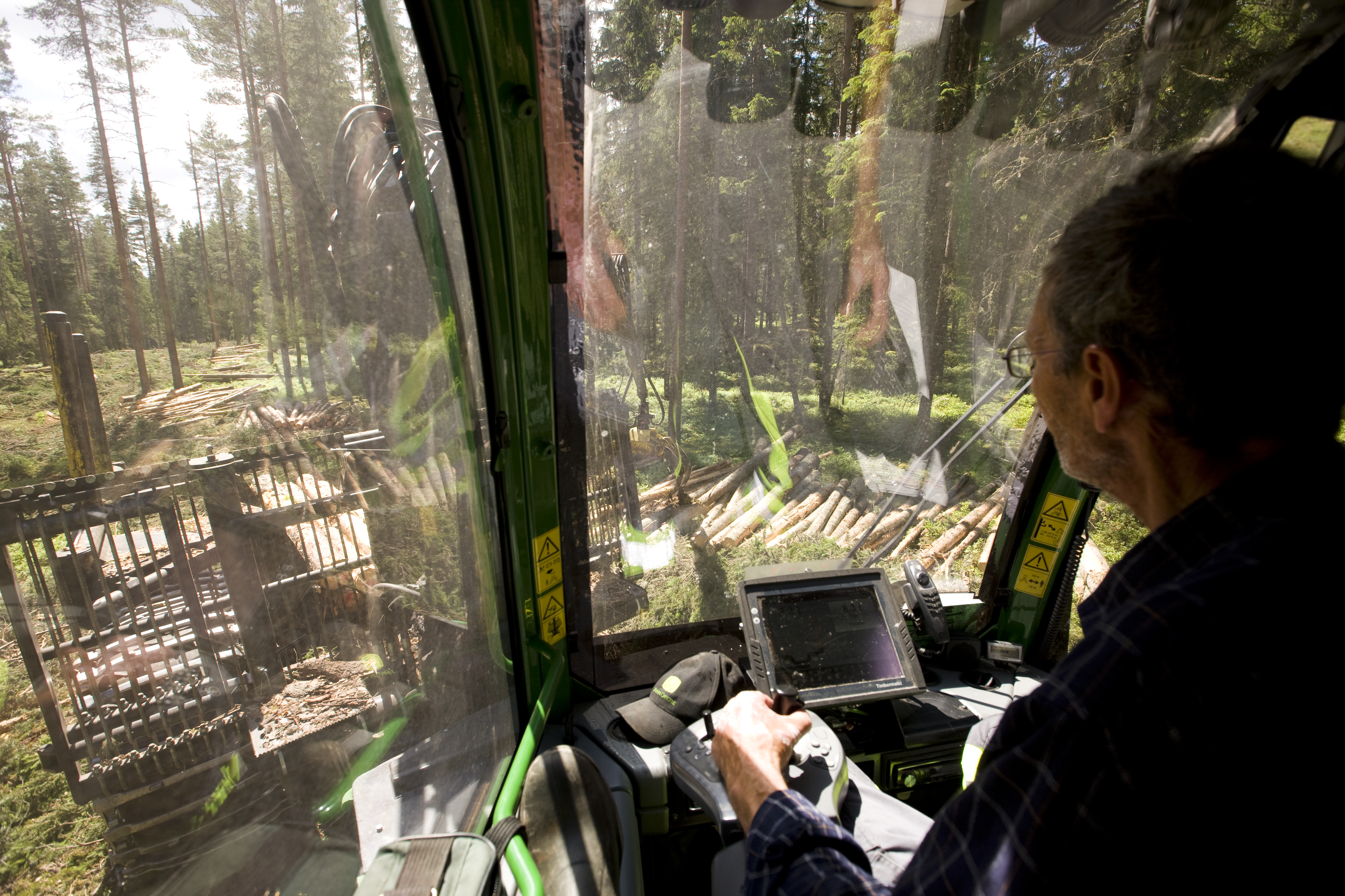 - Beskrivning: i skotaren, insida, förarhytt, förare, hytt, maskinförare, skotare, skotning, skogsmaskin, avverkning