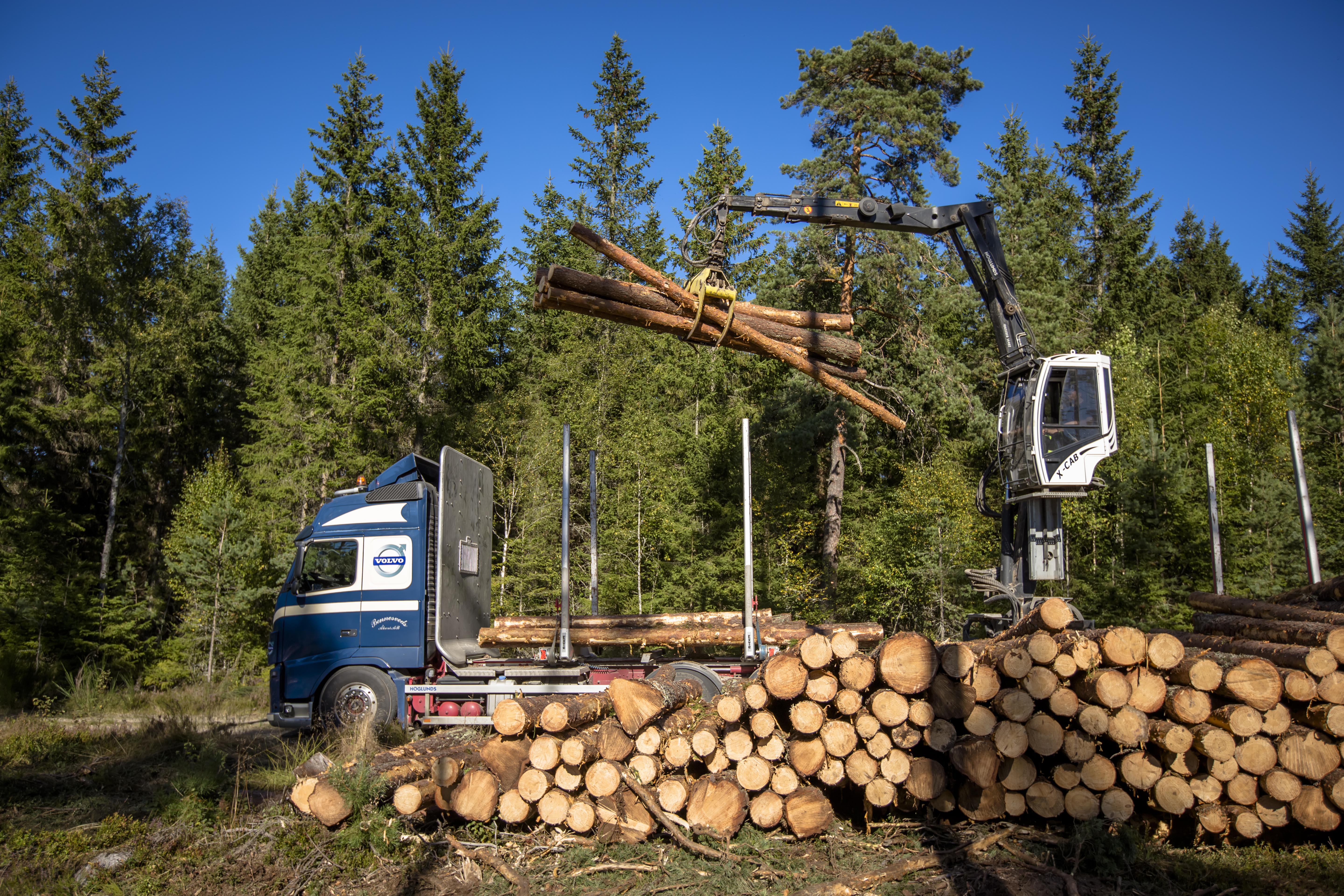 - Beskrivning: timmer, talltimmer, skördare med skotarlass, linnebjörke, avverkning, trä, tall, teknik, utveckling, skogsbruk, avverkningsmetodik, metod, forum sveaskog nr 5 2013