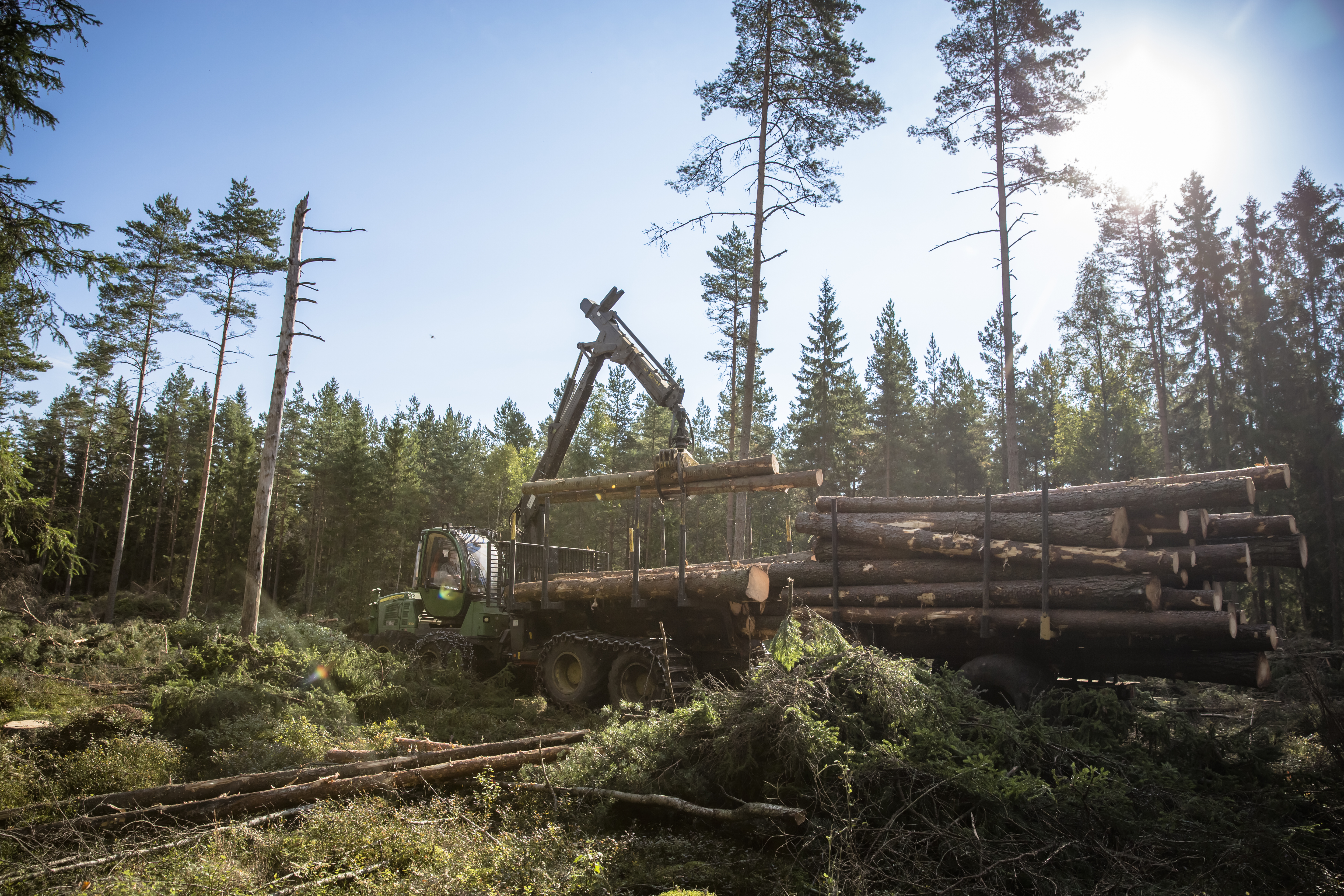 - Beskrivning: timmer, talltimmer, skördare med skotarlass, linnebjörke, avverkning, trä, tall, teknik, utveckling, skogsbruk, avverkningsmetodik, metod, forum sveaskog nr 5 2013