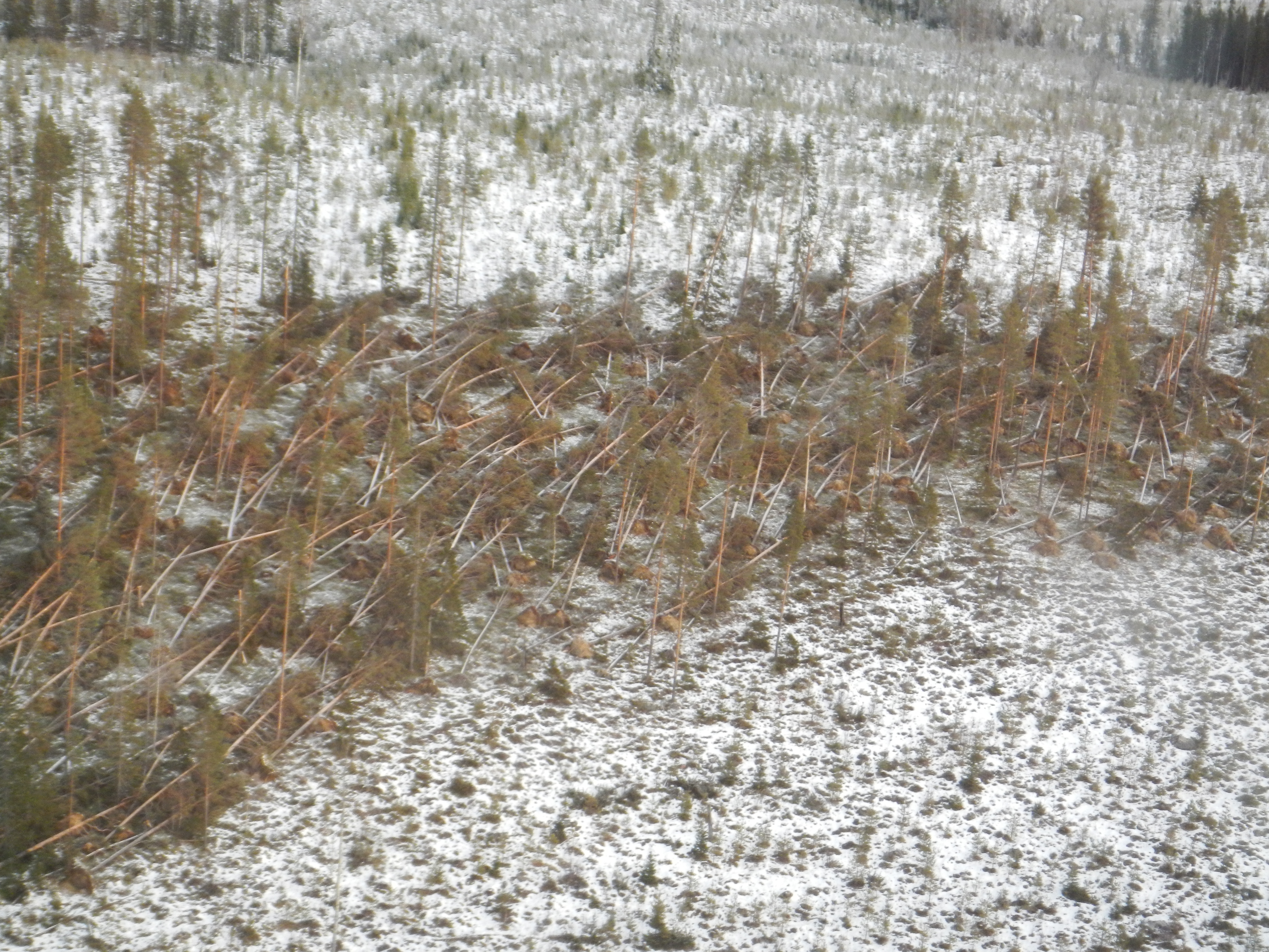- Beskrivning: Bilder från helikopterinventeringen i Västerbotten efter stormen Hilde som inträffade den 16 november 2013, Brutna stammar, stormfällning, stormskador, landskap