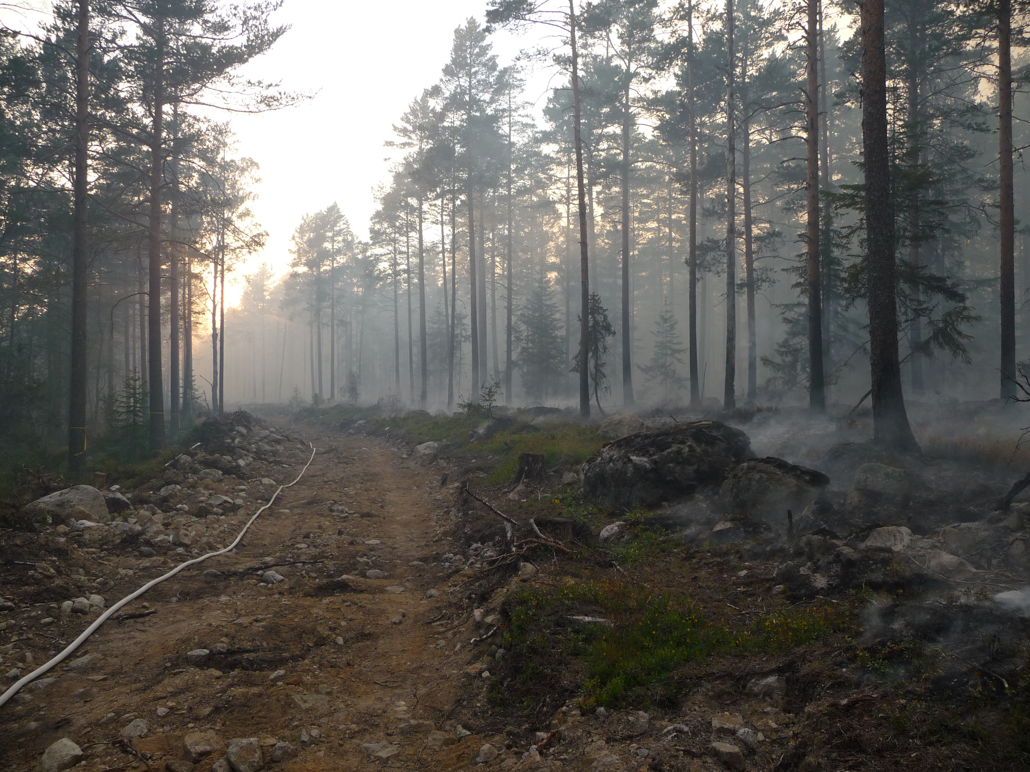 - Beskrivning: Efter naturvårdsbränning, naturvårdsbränningen omfattade 34 hektar tallskog med en medelålder på 110 år, hyggesbränning, brand, rök, aska, brandgata