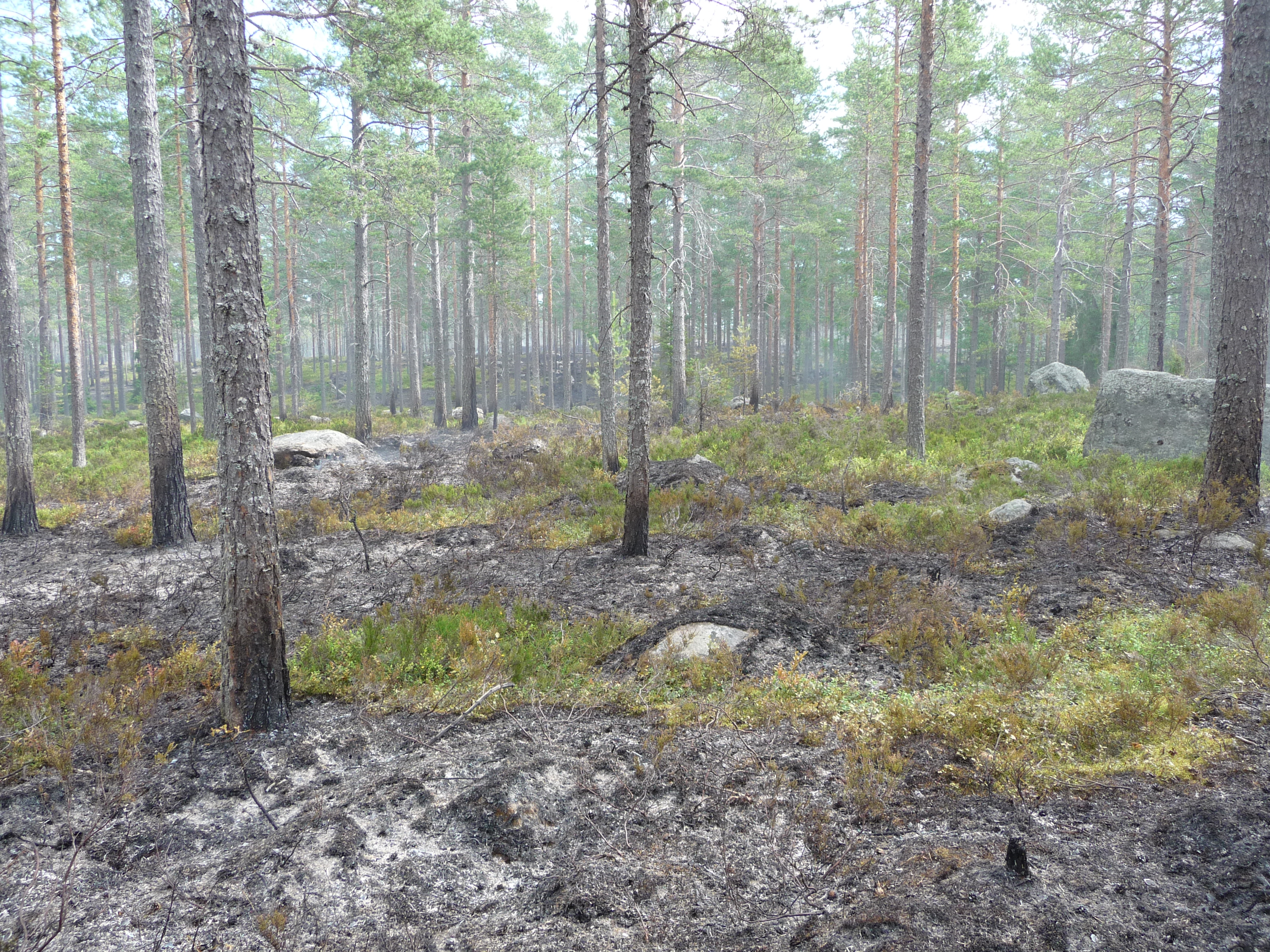 - Beskrivning: Efter naturvårdsbränning, naturvårdsbränningen omfattade 34 hektar tallskog med en medelålder på 110 år, hyggesbränning, brand, aska, rök