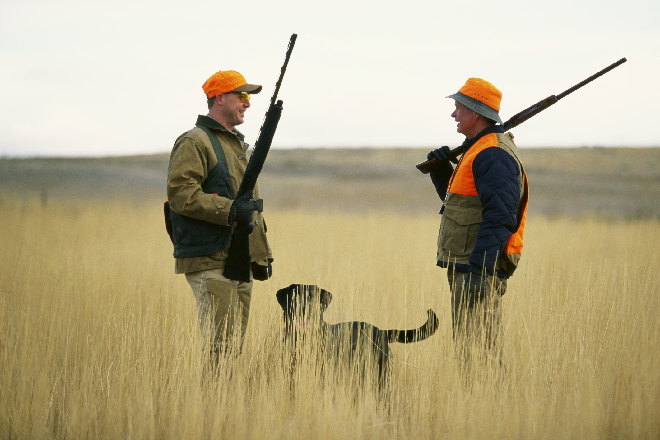 - Beskrivning: Ett par fasanjägare, jakt, hund, labrador retriever, fält, gräs, vapen, gevär, manlig jägare