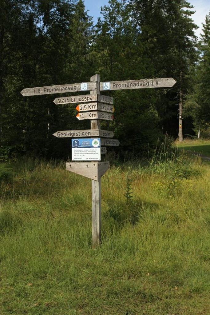 - Beskrivning: Vägskylt, vägskäl, promenadväg, elljusspår, geologistigen, ekopark, skylt