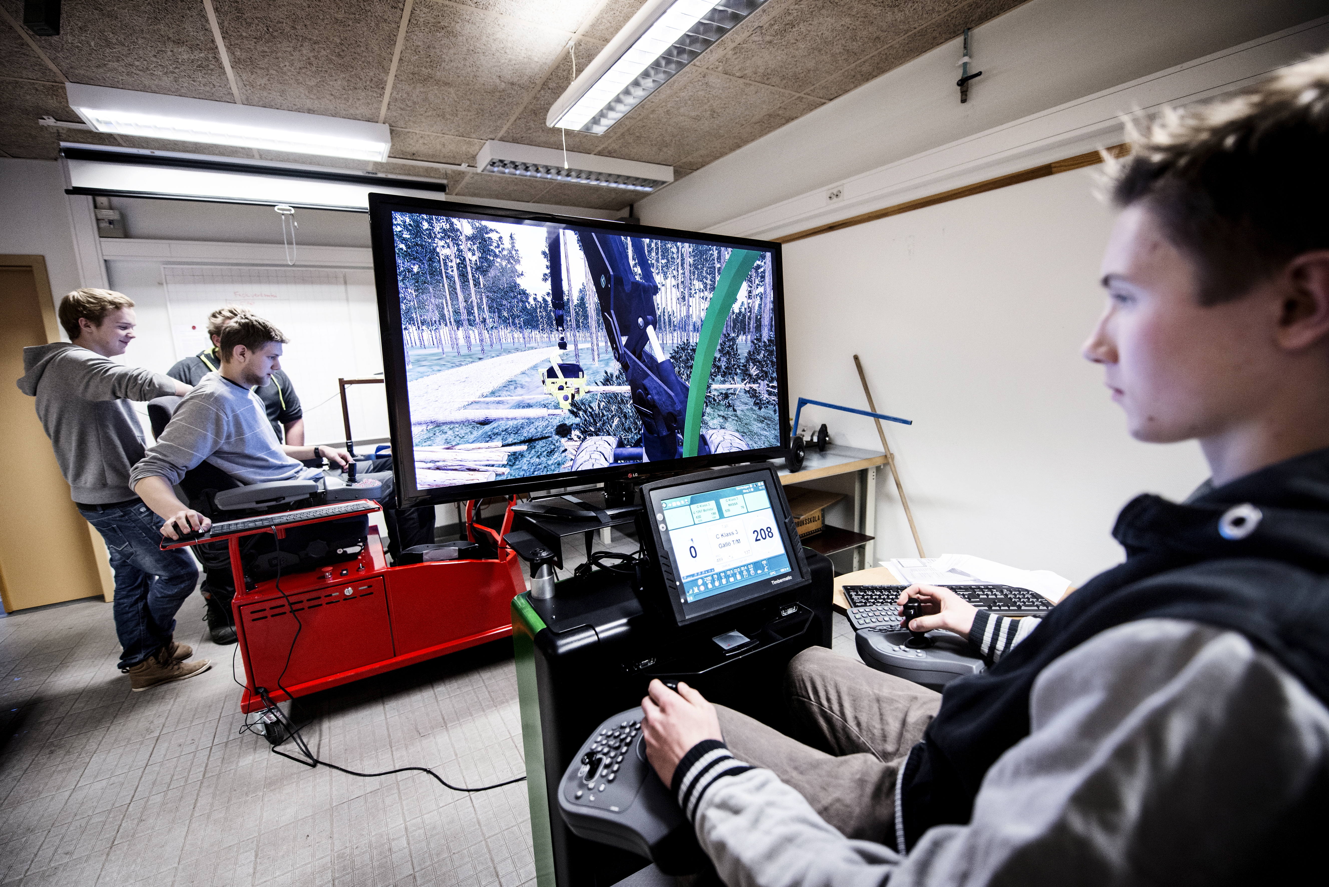 - Beskrivning: Maskinförarsimulation, dator, simulator, skogsbruk, digital avverkning, Forum Sveaskog nr 1 2014, Här säkras framtiden, gymnasium, elever, skola, utbildning, dator, teknik