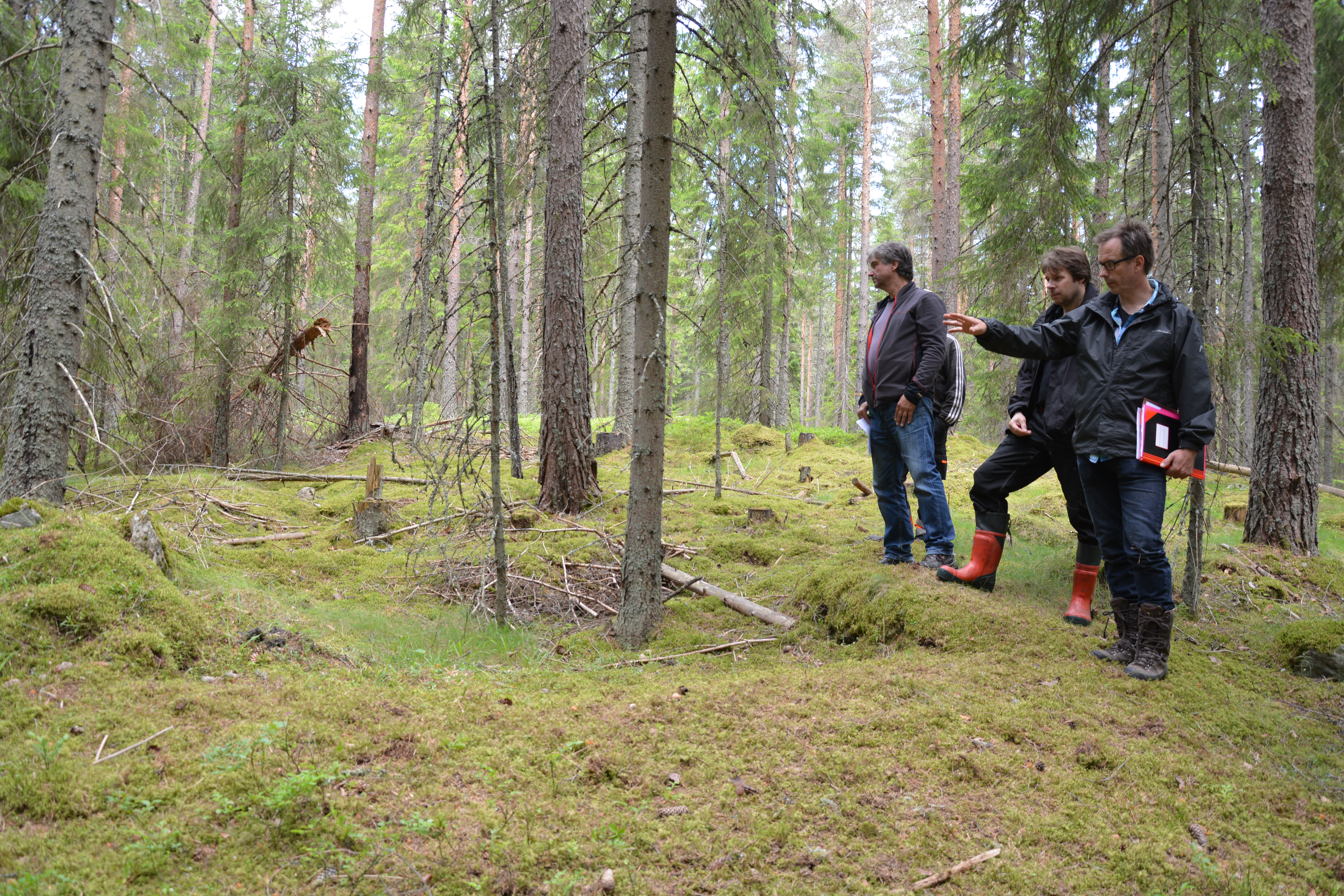 - Beskrivning: Stefan Toterud kursansvarig, förevisar lämningar efter en kolarkoja.Innan den 1 juli ska 400 personer ha genomgått en utbildning i natur- och kulturmiljö med syfte att klara kompetenskravet för PEFC-certifiering