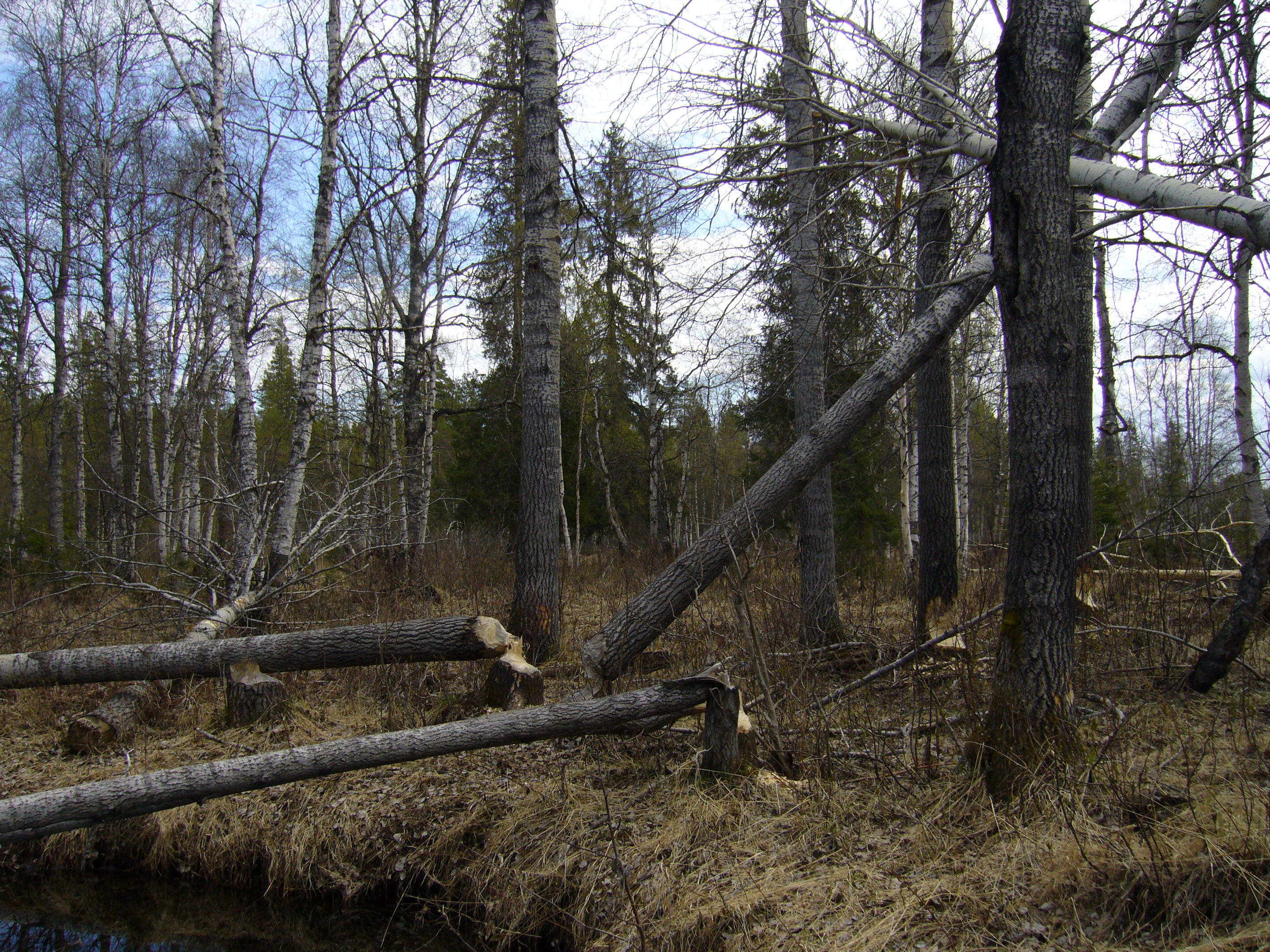 - Beskrivning: Ekopark Varjisån, Bäverfällda aspar, skador