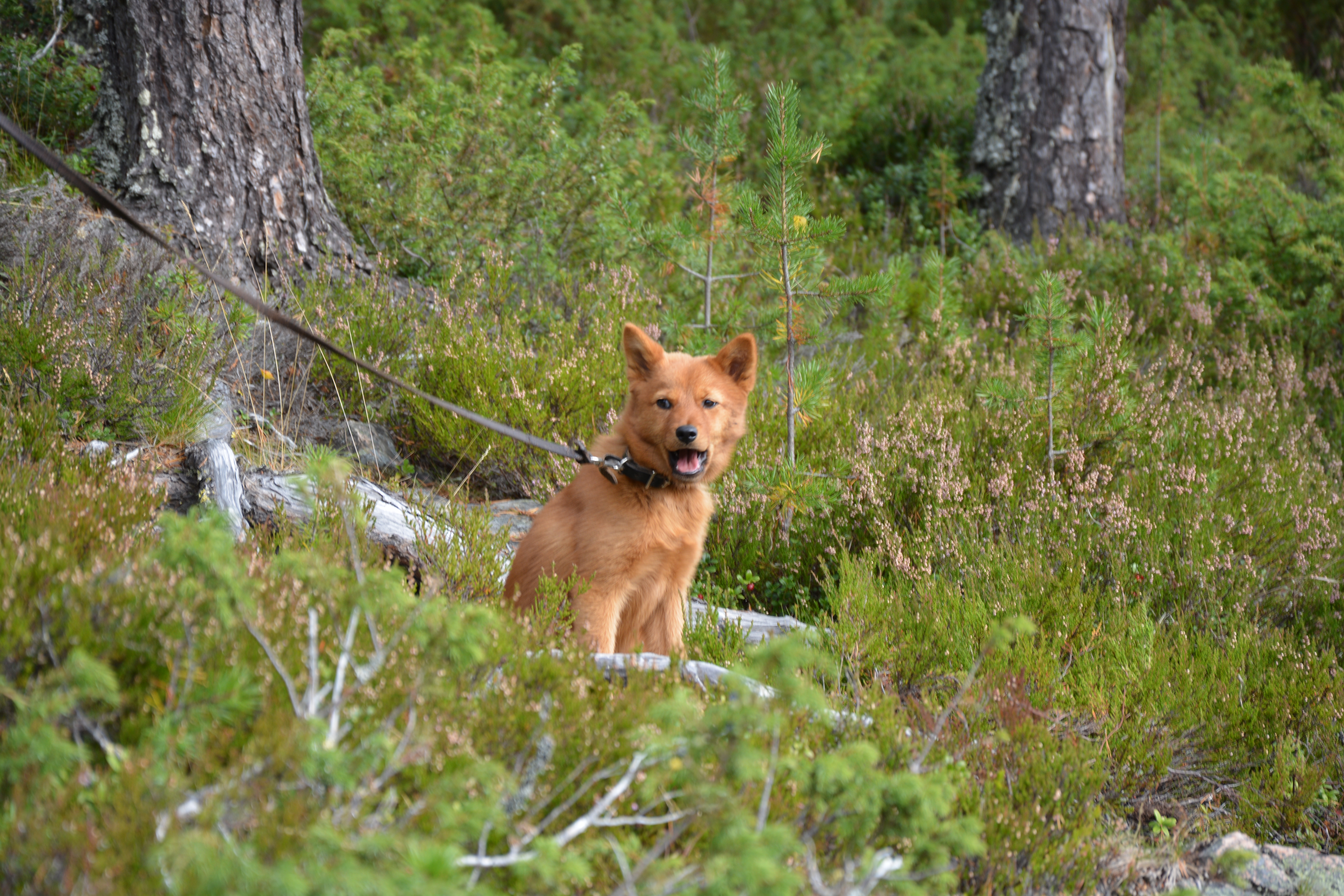 • Beskrivning: Hund som sitter i skogen i Ekopark Fjätälven