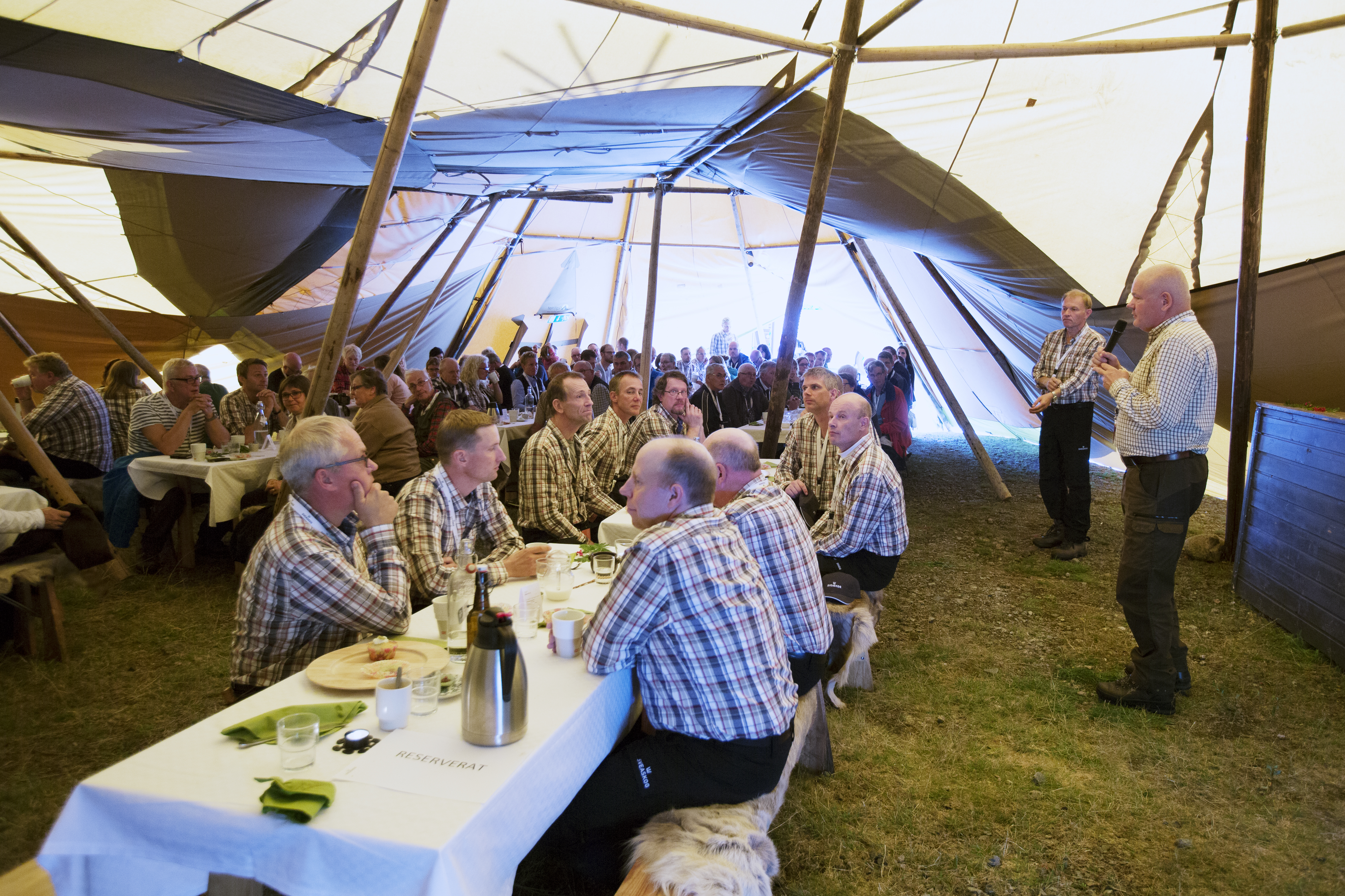 - Beskrivning: Stefan Bleckert pratar, Invigning av Ekopark Piteälven och Varjisån, lunch, På menyn stod bland annat, björkkryddade sticks med tall- och granskottsdipp, kallrökt öring, gravat reninnanlår och skvattramkryddad älgstek.