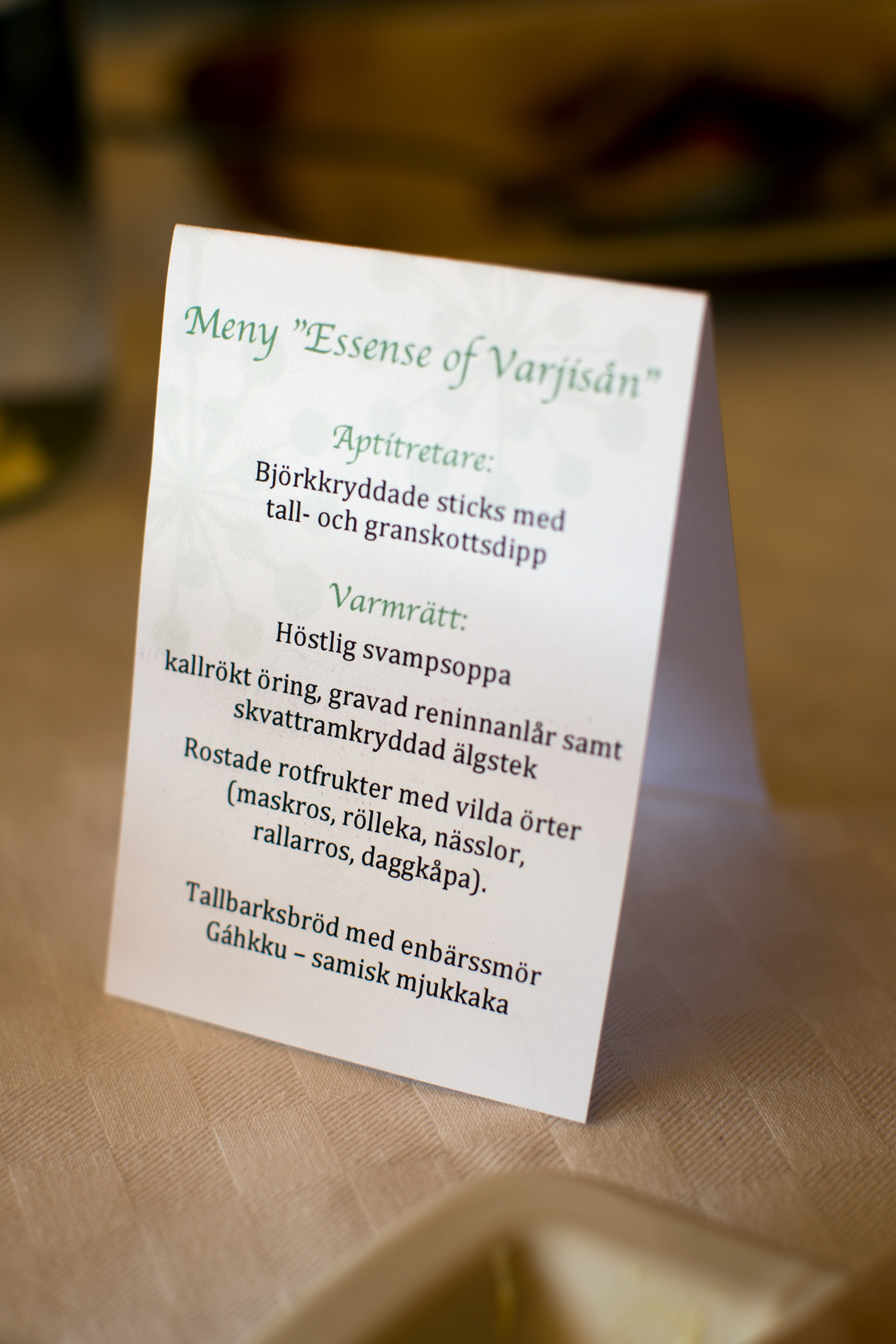 - Beskrivning: Invigning av Ekopark Piteälven och Varjisån, menyn, bland annat björkkryddade sticks med tall- och granskottsdipp, kallrökt öring, gravat reninnanlår och skvattramkryddad älgstek. Essense och Varjisån