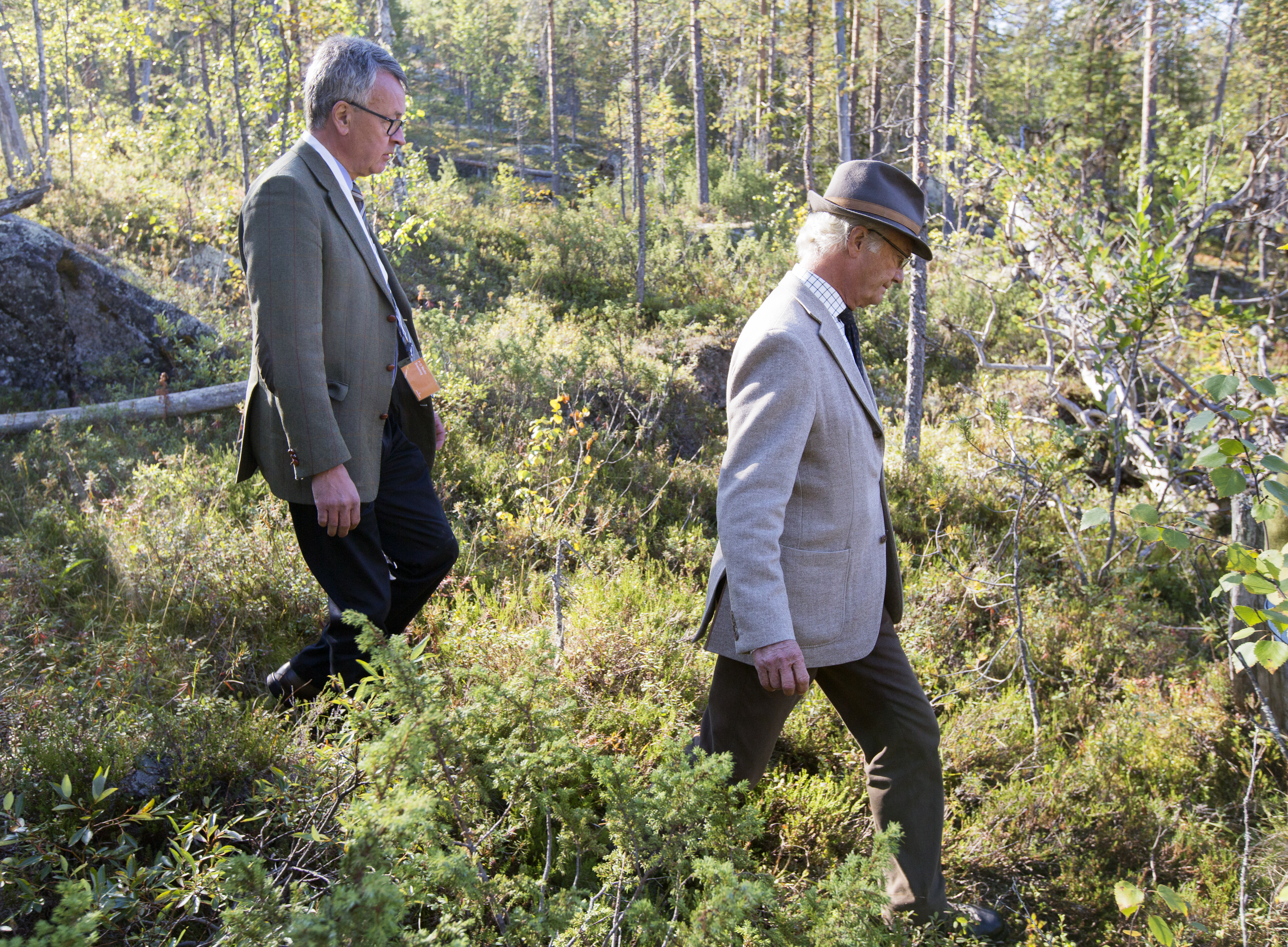 - Beskrivning: PO Per-Olof Wedin, vd och kungen HMK Carl XVI Gustaf går genom skogen, Invigning av Ekopark Piteälven och Varjisån