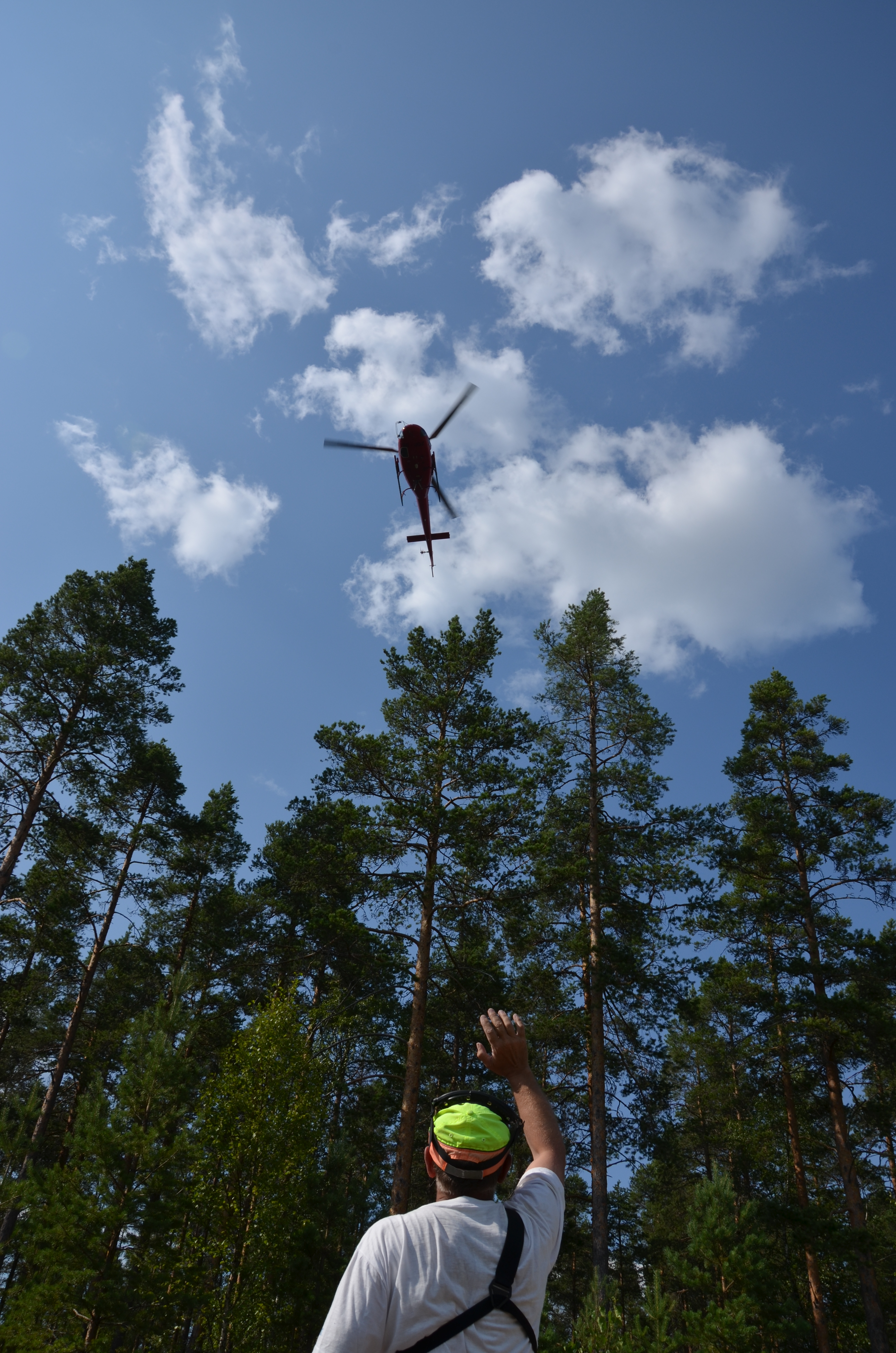 • Beskrivning: Person vinkar till helikopter ovan, Kontrollerad naturvårdsbränning, bränning i Ekopark Ejheden i Rättviks kommun, avbruten