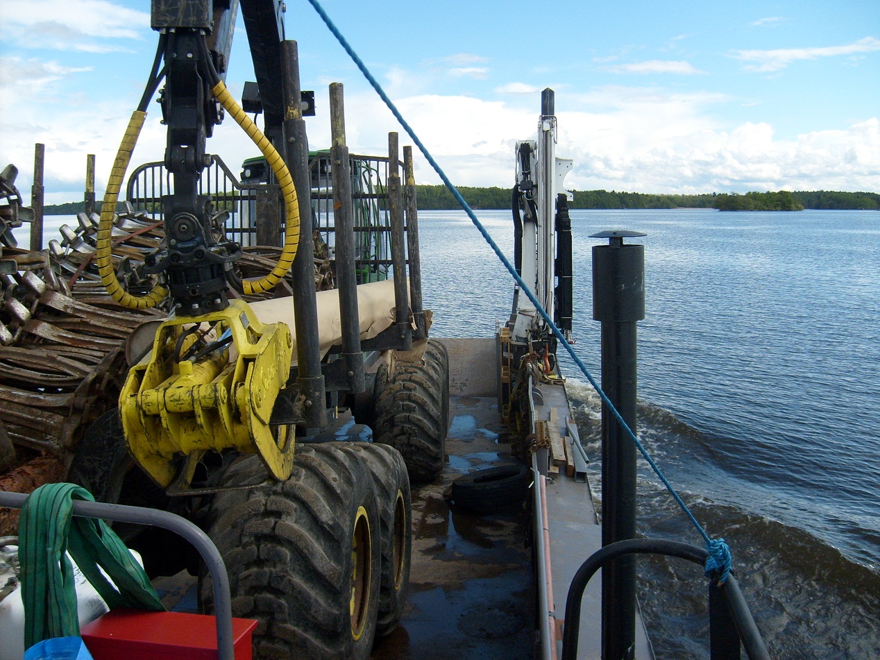 - Beskrivning: Sjönära naturvårdsprojekt, naturvård, skotare som åker båt, förflyttning av fordon