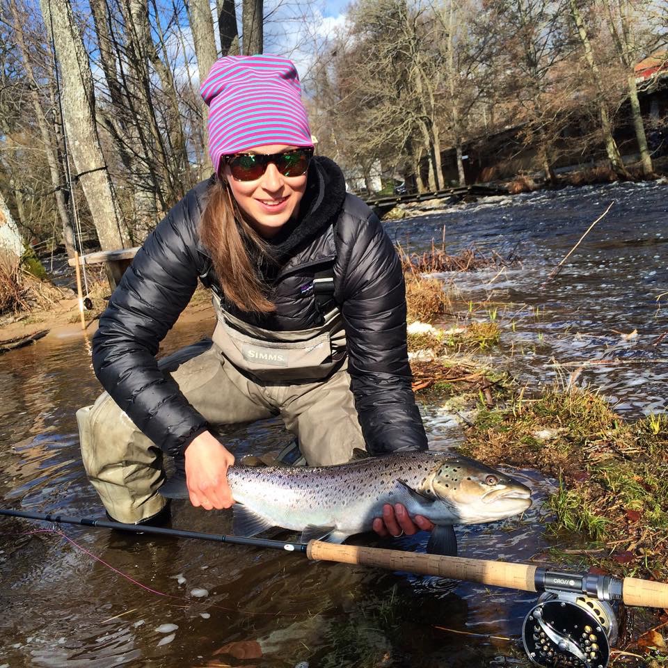 - Beskrivning: Emma Condrup, Helsingborg, öring 65 cm pool 1, Premiär Mörrum 2015, 75-årsjubileum, jubileum, sportfiskefest, laxfiskepremiär, laxfiske, 75 år, Mörrums Kronolaxfiske