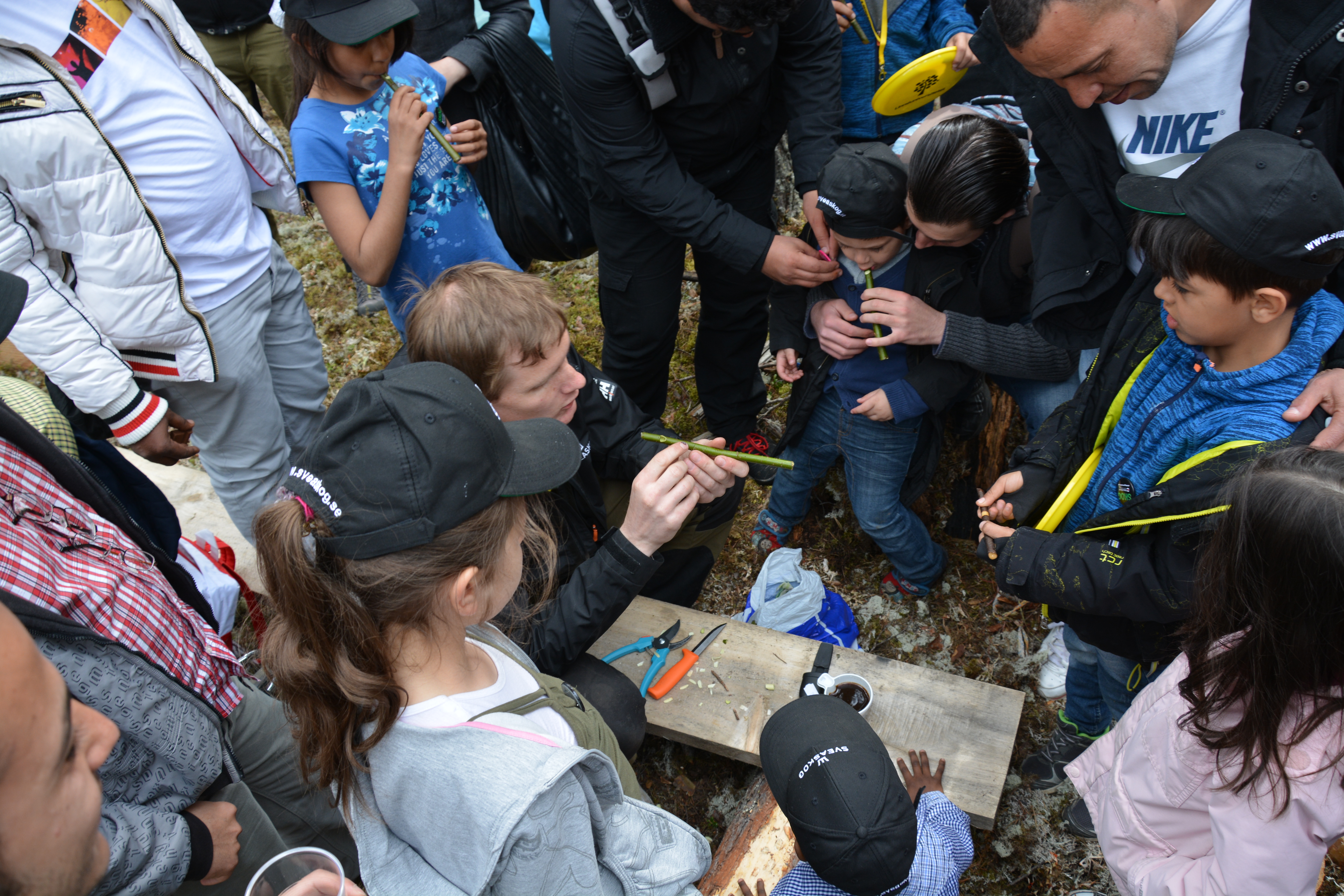 - Beskrivning: Barn och vuxna samlade runt Jonas Jonsson då han visar hur man gör sälgpipor, Skogsdag för nysvenskar i Södra Norrland i samarbete med Linnéuniversitetet och VIF, Vänskap och Integrationsföreningen