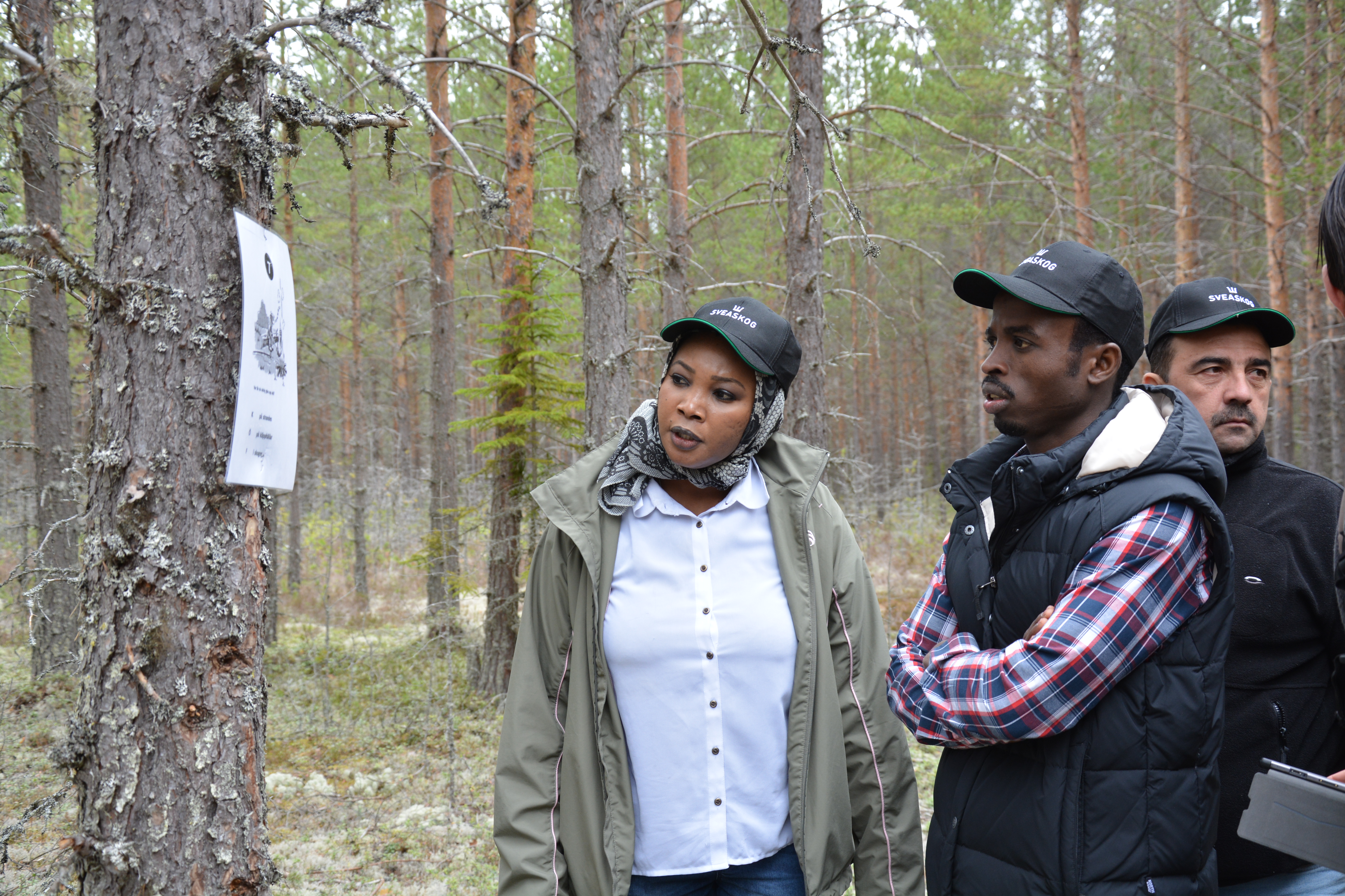 - Beskrivning: Två deltagare som funderar över svaret på en av frågorna på tipsrundan, Skogsdag för nysvenskar i Södra Norrland i samarbete med Linnéuniversitetet och VIF, Vänskap och Integrationsföreningen