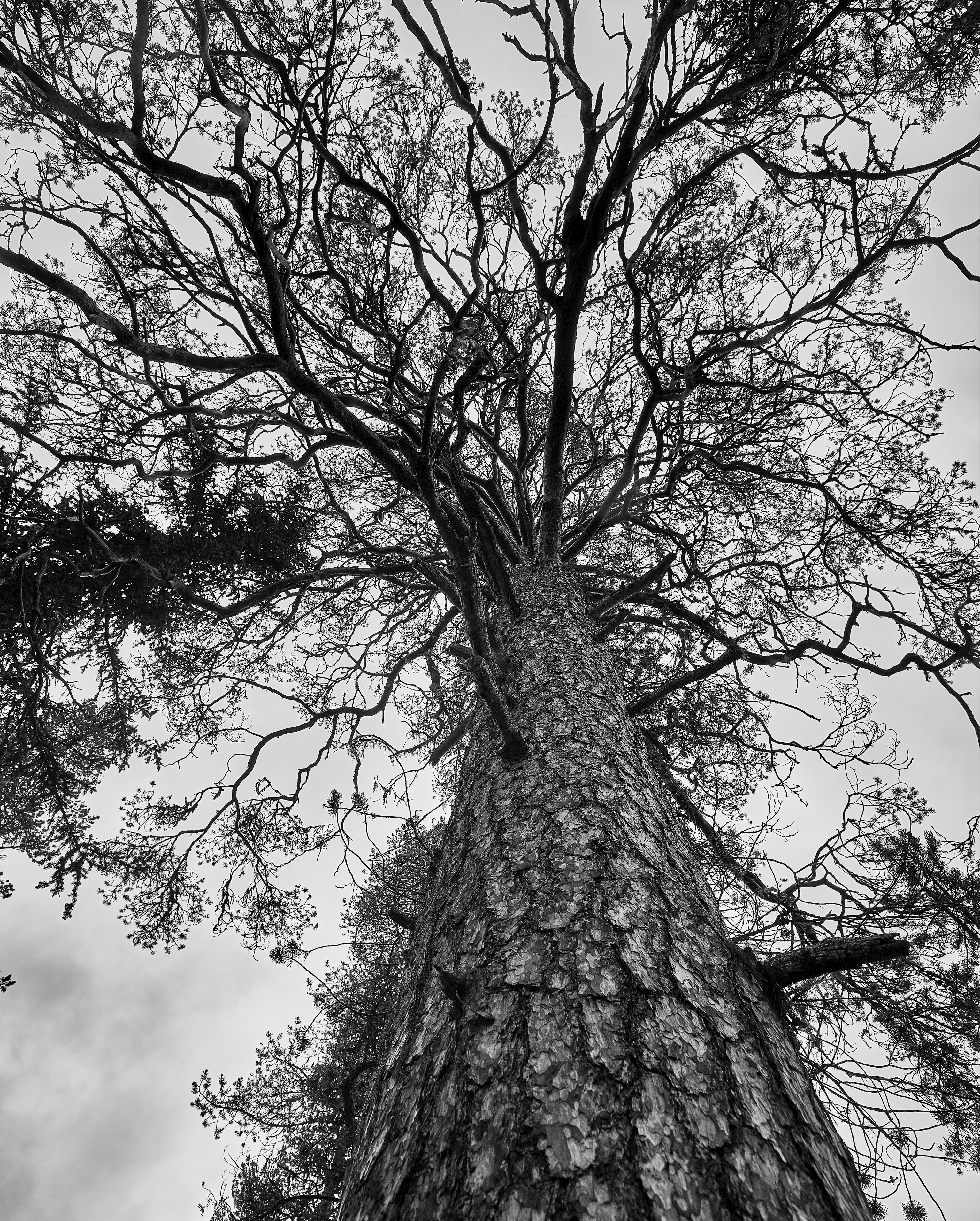 - Beskrivning: Gammeltallen i Ekopark Naakajärvi, svartvit, gråskala, tall, stam, bark