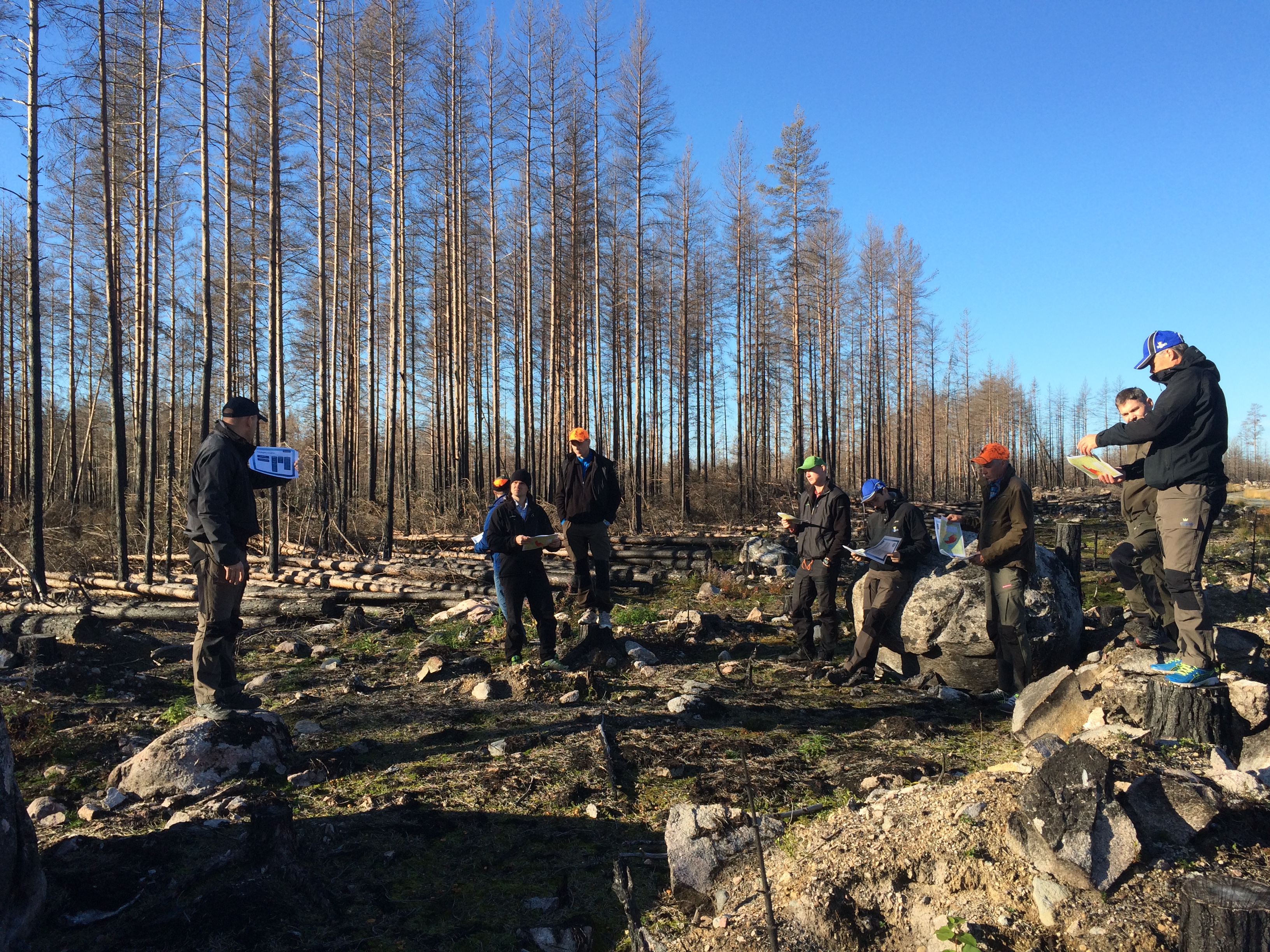 - Beskrivning: Johan Klingberg, AB Karl Hedin informerar, Efter skogsbrand, pånyttfödelse, Kundbesök i brandområdet utanför Sala