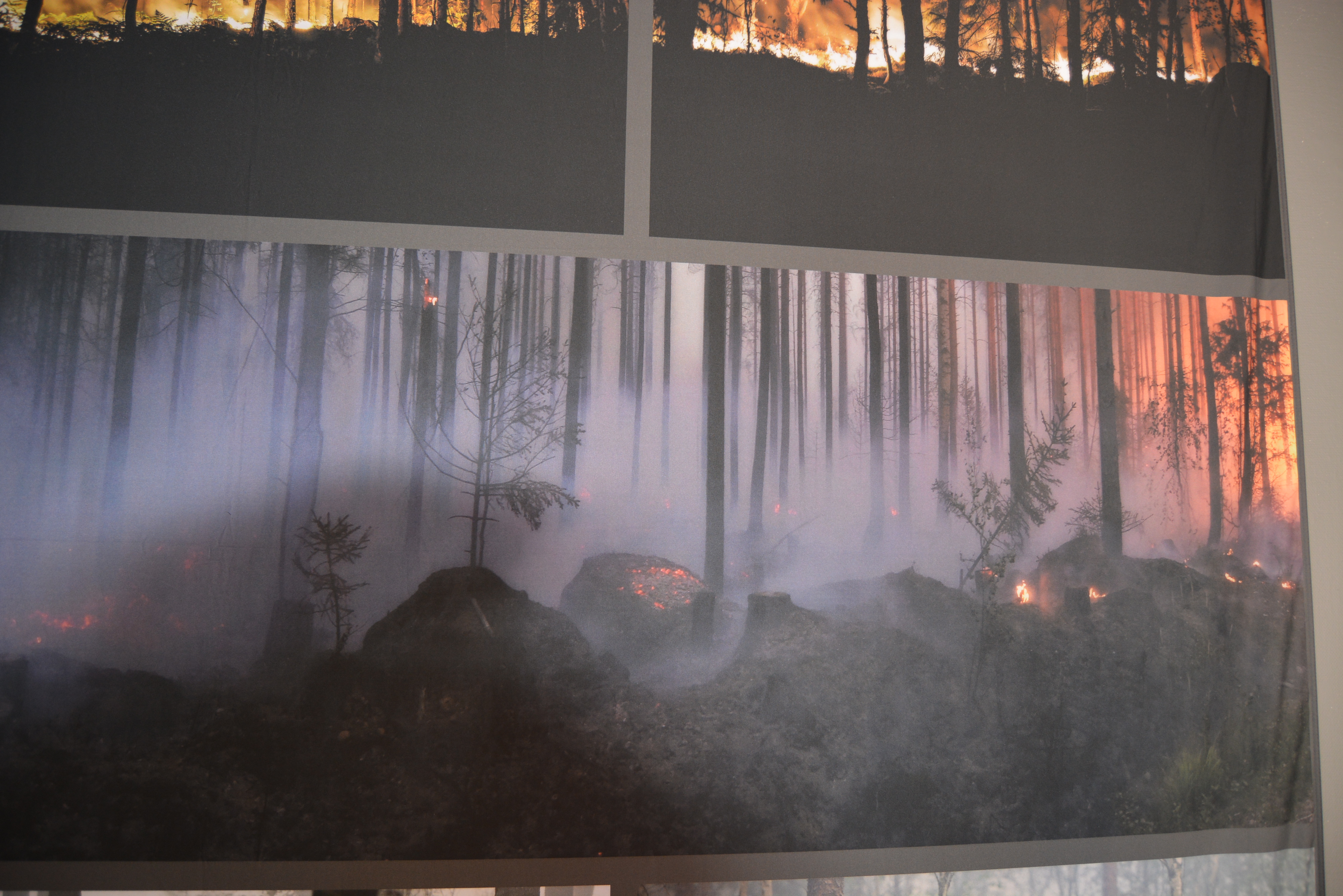 • Beskrivning: Bilder på väggen, Besökscentrum, informationscentrum, Besökscenter Elden & Skogen i Ramnäs, för att visa vad som händer efter en skogsbrand, process, information, skogsbrand