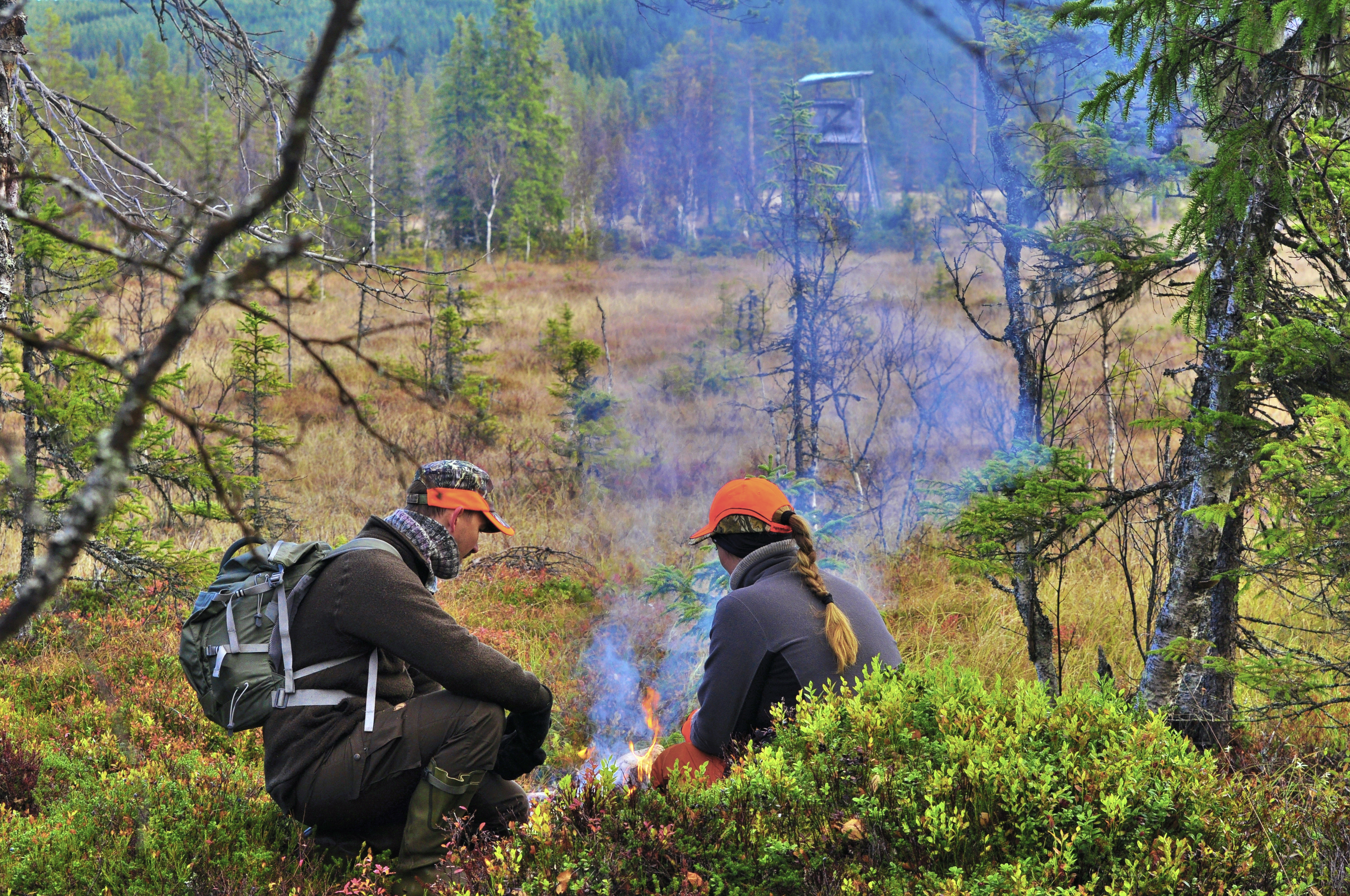 - Beskrivning: jägarpar, man och kvinna, par, vänner, kompisar, kärlek, efter jakt, lunch, värme, brasa
